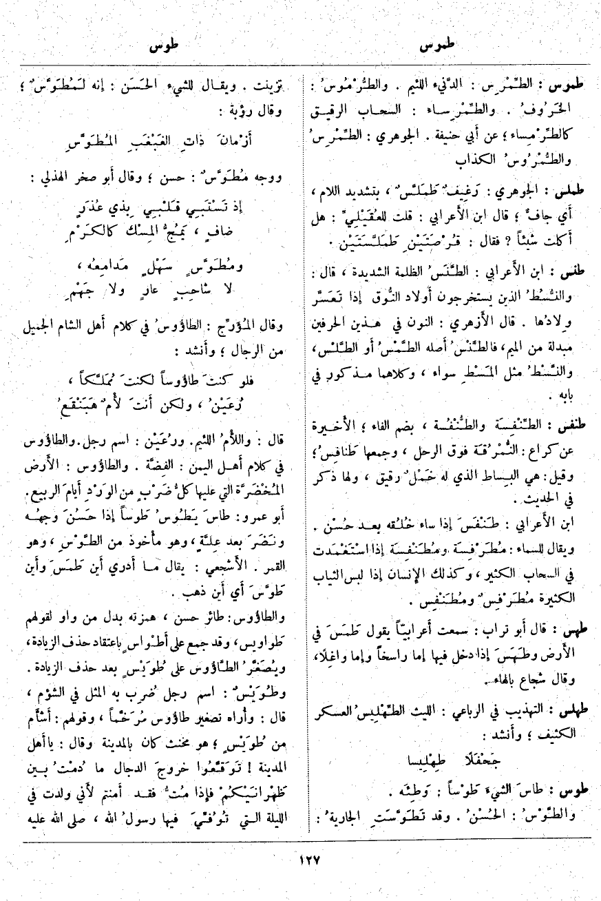 طوس: طاسَ الشيءَ طَوْساً: وَطِئَه. والطَّوْسُ: الحُسْنُ. وَقَدْ تَطَّوَّسَتِ الجاريةُ: تَزَيَّنَتْ. وَيُقَالُ لِلشَّيْءِ الحَسَن؛ إِنه لَمُطَوَّسٌ؛ وقال رُؤْبَةُ: