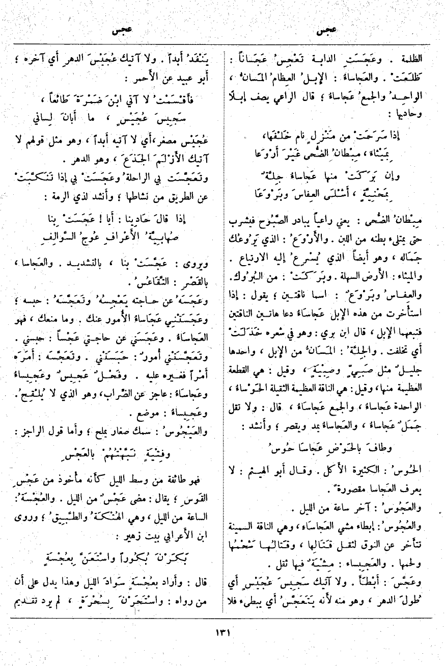 وَيُرْوَى: عَجَّسَتْ بِنَا، بِالتَّشْدِيدِ. والعَجاسا، بالقَصْرِ: التَّقَاعُسُ. وعَجَسَهُ عَنْ حَاجَتِهِ يَعْجِسُهُ وتَعَجَّسَهُ: حَبَسَهُ؛ وعَجَسَتْنِي عَجَاساءُ الأُمور عَنْكَ. وَمَا مَنَعَكَ، فَهُوَ العَجاسَاءُ. وعَجَسَني عَنْ حَاجَتِي عَجْساً: حَبَسَنِي. وتَعَجَّسَتْني أُمورٌ: حَبَسَتْني. وتَعَجَّسَه: أَمَرَه أَمْراً فَغَيَّرَهُ عَلَيْهِ. وفَحْلٌ عَجِيسٌ وعَجِيساءُ وعَجاسَاءُ: عَاجِزٌ عَنِ الضِّراب، وَهُوَ الَّذِي لَا يُلْقِحُ. وعَجِيساءُ: مَوْضِعٌ. والعَيْجُوسُ: سَمَكٌ صِغَارٌ يُمَلَّحُ؛ وأَما قَوْلُ الرَّاجِزِ: