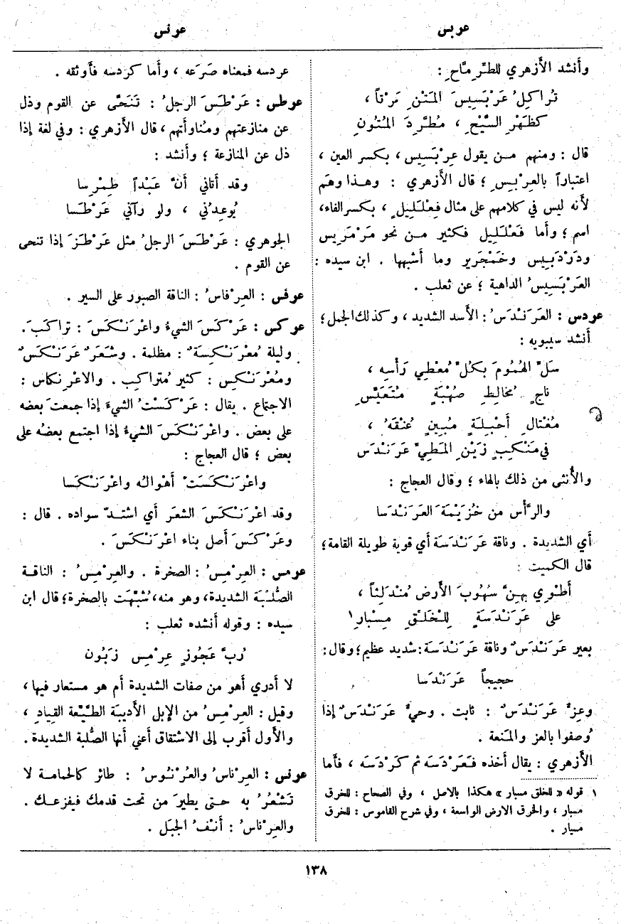 عرنس: العِرْناسُ والعُرْنُوسُ: طَائِرٌ كَالْحَمَامَةِ لَا تَشْعُرُ بِهِ حَتَّى يطيرَ مِنْ تَحْتِ قَدَمِكَ فَيُفْزِعَكَ. والعِرْناسُ: أَنْفُ الجبَل.
