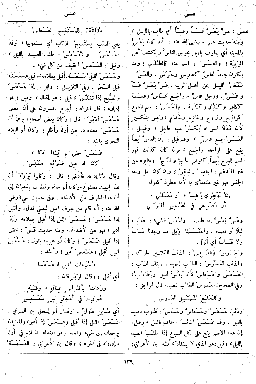 يَعْنِي الذِّئْبَ يَسْتَنِيحُ الذِّئَابَ أَي يَسْتَعْوِيهَا، وَقَدْ تَعَسْعَسَ. والتَّعَسْعُسُ: طلب الصيد بالليل، وقيل: العَسْعاسُ الْخَفِيفُ مِنْ كُلِّ شَيْءٍ. وعَسْعَسَ الليلُ عَسْعَسَة: أَقبل بِظَلَامِهِ، وَقِيلَ عَسعَسَتُه قَبْلَ السَّحَر. وَفِي التَّنْزِيلِ: وَاللَّيْلِ إِذا عَسْعَسَ وَالصُّبْحِ إِذا تَنَفَّسَ