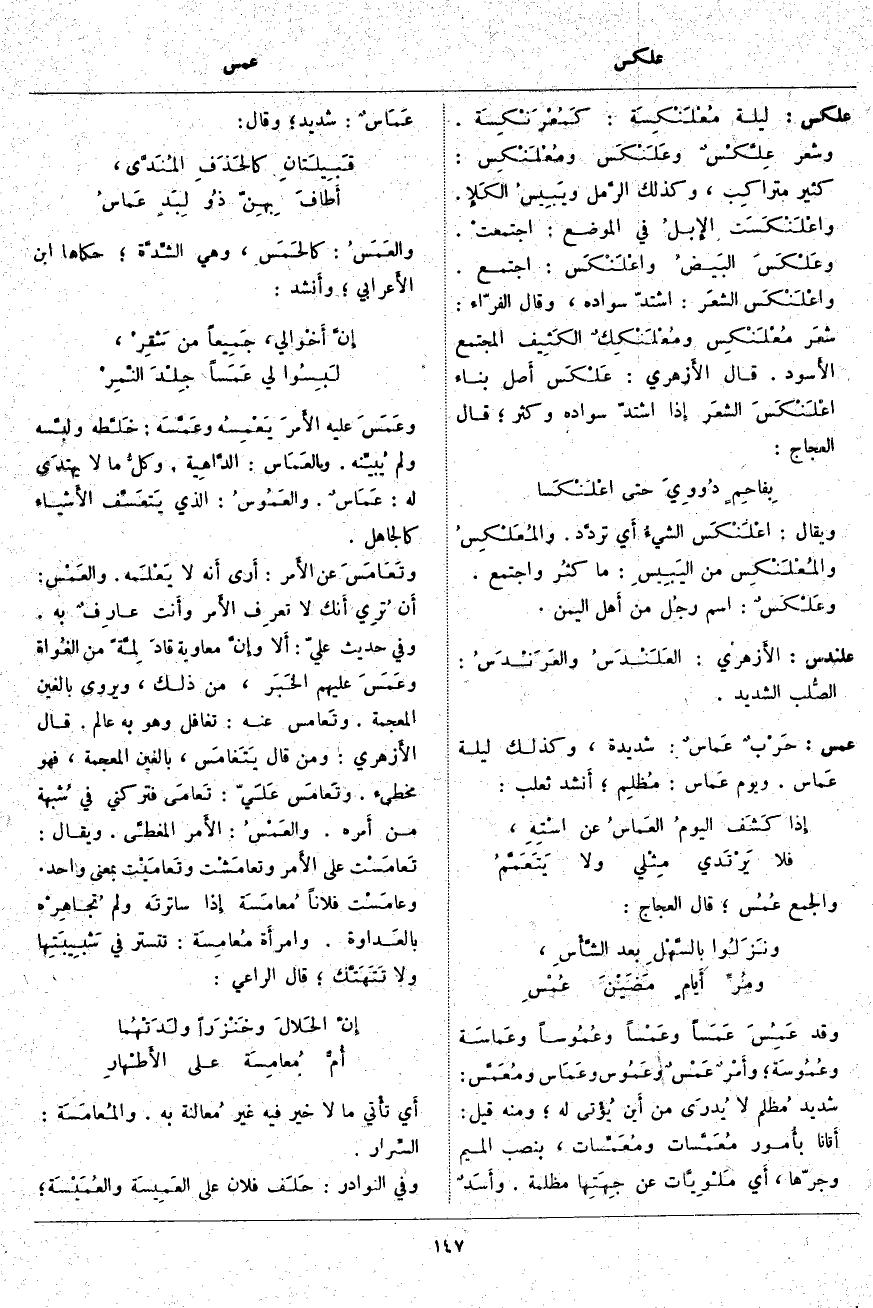 علكس: لَيْلَةً مُعْلَنْكِسَة: كَمُعْرَنْكِسَة. وَشَعَرٌ عِلَّكْسٌ وعَلَنْكَس ومُعْلَنْكِس: كَثِيرٌ متراكِب، وَكَذَلِكَ الرَّمل ويَبِيسُ الكَلإِ. واعْلَنْكَسَت الإِبلُ فِي الْمَوْضِعِ: اجتمعتْ. وعَلْكَسَ البَيضُ واعْلَنْكَس: اجْتَمَعَ. واعْلَنْكَس الشعَر: اشْتَدَّ سَوَادُهُ، وَقَالَ الْفَرَّاءُ: شعَر مُعْلَنْكِس ومُعْلَنْكِكٌ الكَثِيف الْمُجْتَمِعُ الأَسود. قَالَ الأَزهري: عَلْكَس أَصل بِنَاءِ اعْلَنْكَسَ الشعَر إِذا اشْتَدَّ سَوَادُهُ وَكَثُرَ؛ قَالَ الْعَجَّاجِ: