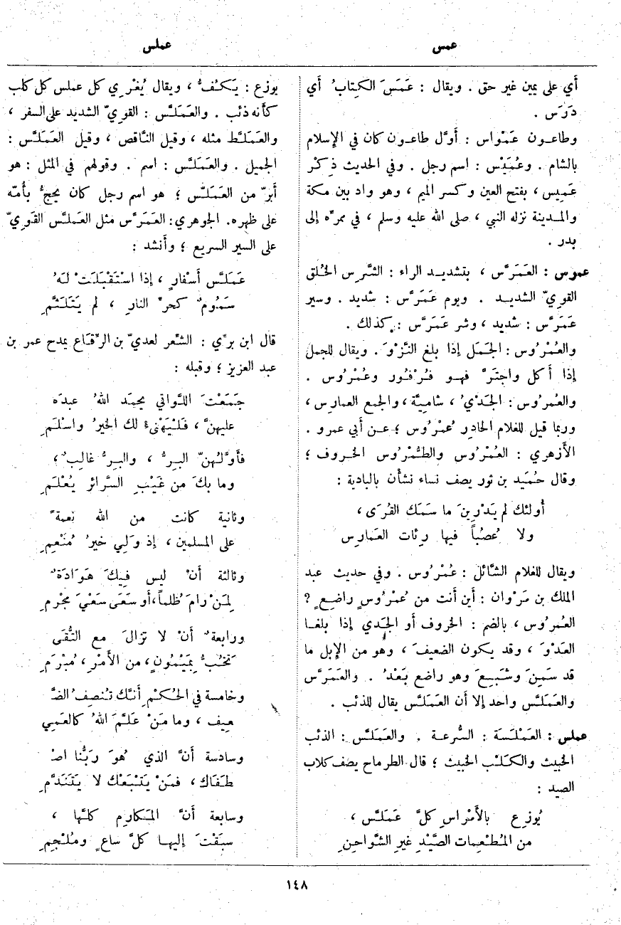 عملس: العَمْلَسَة: السُّرعة. والعَمَلَّس: الذِّئْبُ الْخَبِيثُ والكَلْب الْخَبِيثُ؛ قَالَ الطِّرِمَّاحُ يَصِفُ كِلَابَ الصَّيْدِ: