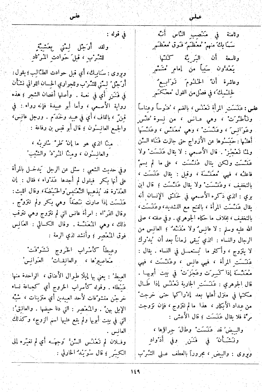 ، وَقَالَ اللَّيْثُ: عَنَسَت إِذا صَارَتْ نَصَفاً وَهِيَ بِكْرٌ وَلَمْ تتزوَّج. وَقَالَ الفَرَّاء: امرأَة عَانِسٌ الَّتِي لم تَتَزَوَّجُ وَهِيَ تَتَرَقَّبُ ذَلِكَ، وَهِيَ المُعَنَّسة. وَقَالَ الْكِسَائِيُّ: العَانِس فَوْقَ المُعْصِر؛ وأَنشد لِذِي الرُّمَّةِ: