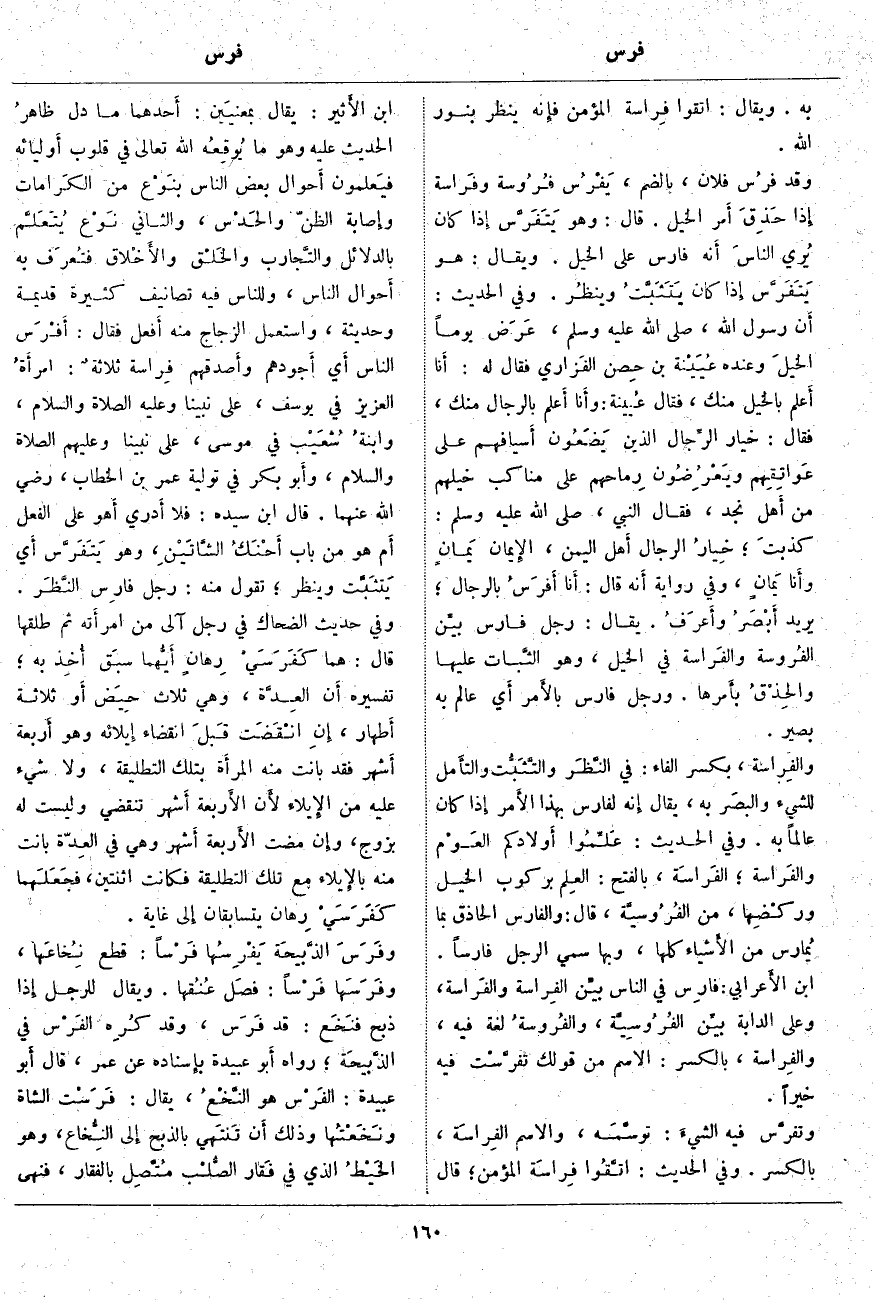 ؛ قَالَ ابْنُ الأَثير: يُقَالُ بمعنيَين: أَحدهما مَا دَلَّ ظاهرُ الْحَدِيثِ عَلَيْهِ وَهُوَ مَا يُوقِعُه اللَّه تَعَالَى فِي قُلُوبِ أَوليائه فيَعلمون أَحوال بَعْضِ النَّاسِ بنَوْع مِنَ الكَرامات وإِصابة الظَّنِّ والحَدْس، وَالثَّانِي نَوْع يُتَعَلَّم بِالدَّلَائِلِ والتَّجارب والخَلْق والأَخْلاق فتُعرَف بِهِ أَحوال النَّاسِ، وَلِلنَّاسِ فِيهِ تَصَانِيفُ كَثِيرَةٌ قَدِيمَةٌ وَحَدِيثَةٌ، وَاسْتَعْمَلَ الزَّجَّاجُ مِنْهُ أَفعل فَقَالَ: أَفْرَس النَّاسِ أَي أَجودهم وأَصدقهم فِراسة ثلاثةٌ: امرأَةُ الْعَزِيزِ فِي يُوسُفَ، عَلَى نَبِيِّنَا وَعَلَيْهِ الصَّلَاةُ وَالسَّلَامُ، وابنةُ شُعَيْب فِي مُوسَى، عَلَى نَبِيِّنَا وَعَلَيْهِمُ الصَّلَاةُ وَالسَّلَامُ، وأَبو بَكْرٍ فِي تَوْلِيَةِ عُمَرَ بْنِ الْخَطَّابِ، رَضِيَ اللَّه عَنْهُمَا. قَالَ ابْنُ سِيدَهْ: فَلَا أَدري أَهو عَلَى الْفِعْلِ أَمْ هُوَ مِنْ بَابِ أَحْنَكُ الشَّاتَيْنِ، وَهُوَ يَتَفَرَّس أَي يَتثَبَّت وَيَنْظُرُ؛ تَقُولُ مِنْهُ: رَجُلٌ فارِس النَّظَر. وَفِي حَدِيثِ