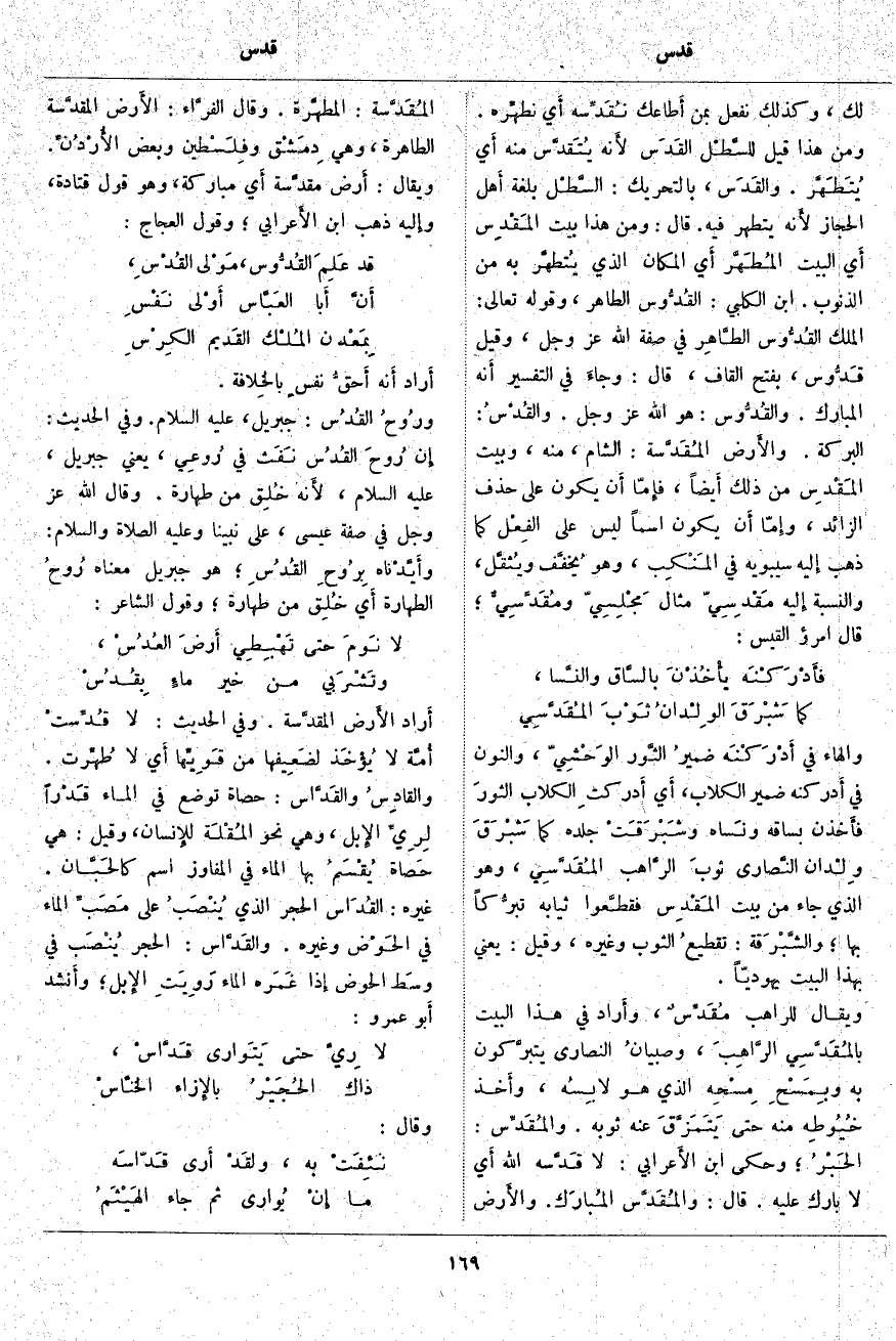 الطَّاهِر فِي صِفَةِ اللَّه عَزَّ وَجَلَّ، وَقِيلَ قَدُّوس، بِفَتْحِ الْقَافِ، قَالَ: وجاءَ فِي التَّفْسِيرِ أَنه الْمُبَارَكُ. والقُدُّوس: هُوَ اللَّه عَزَّ وَجَلَّ. والقُدْسُ: الْبَرَكَةُ. والأَرض المُقَدَّسة: الشَّامُ، مِنْهُ، وَبَيْتُ المَقْدِس مِنْ ذَلِكَ أَيضاً، فإِمّا أَن يَكُونَ عَلَى حَذْفِ الزَّائِدِ، وإِمّا أَن يَكُونَ اسْمًا لَيْسَ عَلَى الفِعْل كَمَا ذَهَبَ إِليه سِيبَوَيْهِ فِي المَنْكِب، وَهُوَ يُخفَّف ويُثقَّل، وَالنِّسْبَةُ إِليه مَقْدِسِيّ مِثَالُ مَجْلِسِيّ ومُقَدَّسِيٌّ؛ قَالَ امْرُؤُ الْقَيْسِ: