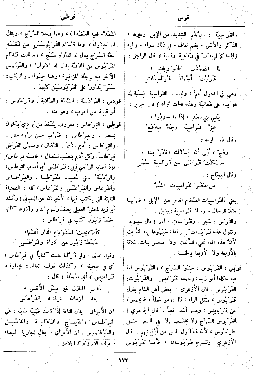 قرطس: القِرْطاس: مَعْرُوفٌ يُتَّخذ مِنْ بَرْدِيّ يَكُونُ بِمِصْرَ. والقِرْطاس: ضَرْب مِنْ برُود مِصْرَ. والقِرْطاس: أَديم يُنْصَب للنِّضال، ويسمَّى الغَرَض قِرْطاساً. وَكُلُّ أَديم ينصَب للنِّضال، فاسمُه قِرطاس، فإِذا أَصابه الرَّامي قِيلَ: قَرْطَس أَي أَصاب الْقِرْطَاسَ، والرَّمْيَةُ الَّتِي تُصيب مُقَرْطِسة. والقِرْطاس والقُرطاس والقَرْطَس [القِرْطس] والقَرْطاس، كُلُّهُ: الصَّحِيفَةُ الثَّابِتَةُ الَّتِي يُكْتَبُ فِيهَا؛ الأَخيرتان عَنِ اللِّحْيَانِيِّ؛ وأَنشد أَبو زَيْدٍ لِمِخَشٍّ الْعُقَيْلِيِّ يَصِفُ رُسُومَ الدَّارِ وَآثَارَهَا كأَنها خَطّ زَبُور كُتِبَ فِي قِرْطاس: