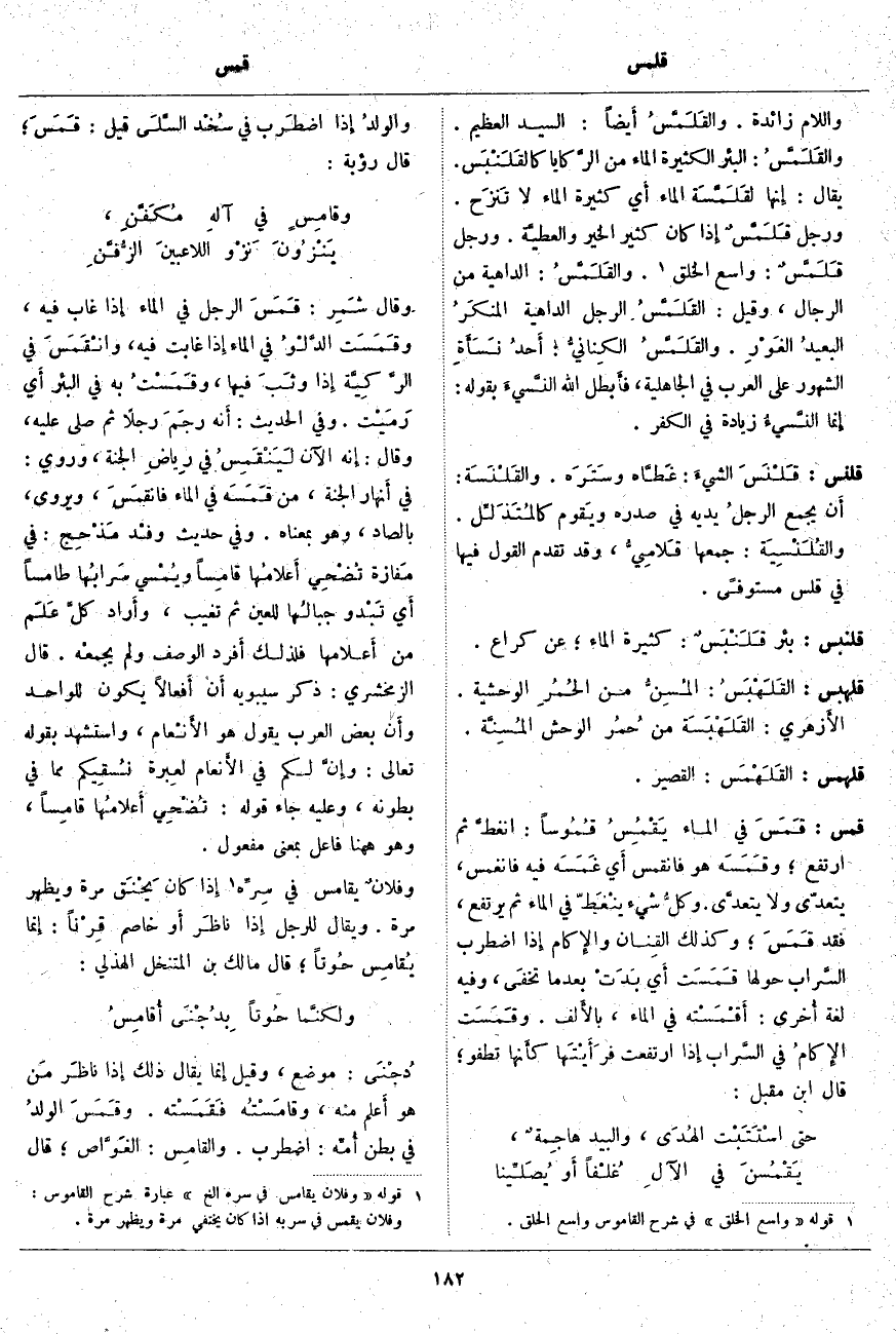 وَاللَّامُ زَائِدَةٌ. والقَلَمَّسُ أَيضاً: السَّيِّدُ الْعَظِيمُ. والقَلَمَّسُ: الْبِئْرُ الْكَثِيرَةُ الْمَاءِ مِنَ الرَّكايا كالقَلَنْبَس. يُقَالُ: إِنها لقَلَمَّسَة الْمَاءِ أَي كَثِيرَةُ الْمَاءِ لَا تَنزَح. وَرَجُلٌ قَلَمَّسٌ إِذا كَانَ كَثِيرَ الْخَيْرِ والعطيَّة. وَرَجُلٌ قَلَمَّسٌ: وَاسِعُ الْخُلُقِ «1». والقَلَمَّسُ: الدَّاهِيَةُ مِنَ الرِّجَالِ، وَقِيلَ: القَلَمَّسُ الرَّجُلُ الدَّاهِيَةُ المنكَرُ البعيدُ الغَوْرِ. والقَلَمَّسُ الكِنانيُّ: أَحدُ نَسَأَةِ الشُّهُورِ عَلَى الْعَرَبِ فِي الْجَاهِلِيَّةِ، فأَبطل اللَّه النَّسيءَ بِقَوْلِهِ: إِنَّمَا النَّسِيءُ زِيادَةٌ فِي الْكُفْرِ.