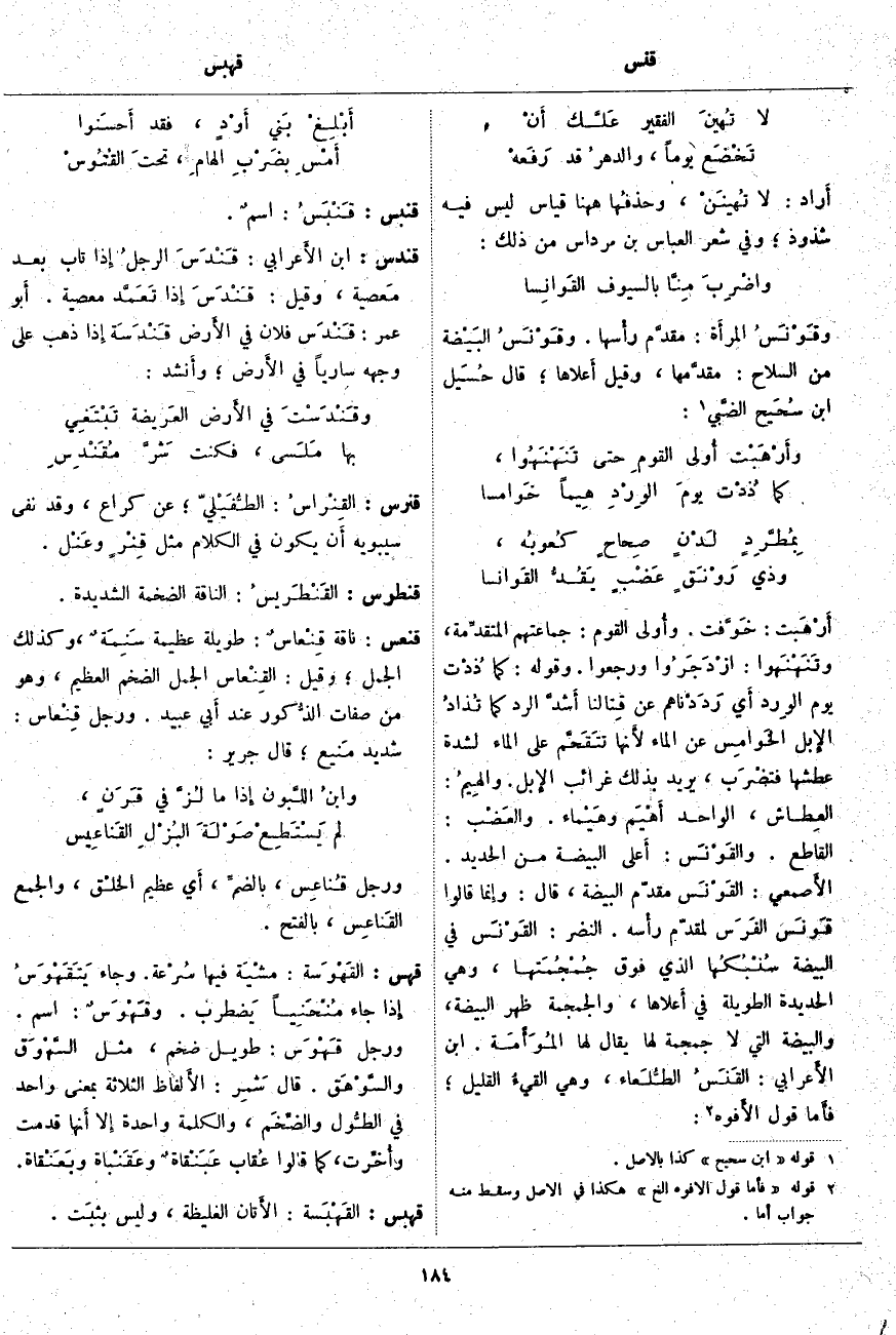 قهس: القَهْوَسة: مشْيَة فِيهَا سُرْعة. وَجَاءَ يَتَقَهْوَسُ إِذا جَاءَ مُنْحَنِياً يَضطرب. وقَهْوَسٌ: اسْمٌ. وَرَجُلٌ قَهْوَس: طَوِيلٌ ضَخْمٌ، مِثْلُ السَّهْوَق والسَّوْهَق. قَالَ شَمِر: الأَلفاظ الثَّلَاثَةُ بِمَعْنًى وَاحِدٍ فِي الطُّول والضِّخَم، وَالْكَلِمَةُ وَاحِدَةٌ إِلا أَنها قُدِّمَتْ وأُخِّرت، كَمَا قَالُوا عُقاب عَبَنْقاةٌ وعَقَنْباة وبَعَنْقاة.