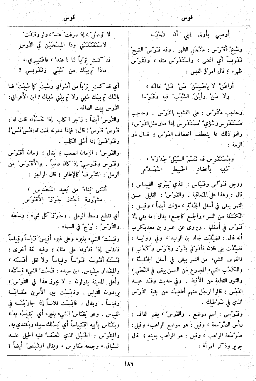 أَي قَدْ كنتِ تِرْباً مِنْ أَتْرابي وشبتِ كَمَا شِبْتُ فَمَا بالُك يَريبُك شَيْبِي وَلَا يَريبُني شَيْبُكِ؟ ابْنُ الأَعرابي: القُوس بَيْتُ الصَّائِدِ. والقُوسُ أَيضاً: زَجر الْكَلْبِ إِذا خَسَأْته قُلْتَ لَهُ: قُوسْ قُوسْ قَالَ: فإِذا دَعَوْتَهُ قُلْتَ لَهُ: قُسْ قُسْ وقَوْقَسَ إِذا أَشلى الْكَلْبَ. والقَوِسُ: الزَّمَانُ الصَّعْبُ؛ يُقَالُ: زَمَانٌ أَقْوَس وقَوِس وقُوسِيّ إِذا كَانَ صَعْبًا، والأَقْوَسُ مِنَ الرَّمْلِ: المشْرِفُ كالإِطارِ؛ قَالَ الرَّاجِزُ: