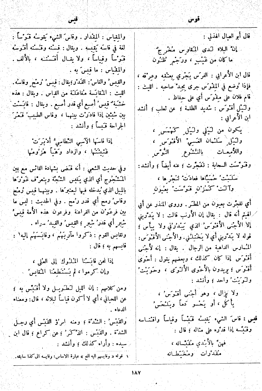 والمِقياس: المِقْدار. وقاسَ الشَّيْءَ يَقوسُه قَوْساً: لُغَةٌ فِي قاسَه يَقِيسه. وَيُقَالُ: قِسْته وقُسْته أَقُوسُه قَوْساً وقِياساً، وَلَا يُقَالُ أَقَسْته، بالأَلف. والمِقْياس: مَا قِيسَ به. والقِيسُ القاسُ: القَدْر، يُقَالُ: قِيسُ رُمحٍ وقاسُه. اللَّيْثُ: المُقايَسة مُفاعَلَة مِنَ الْقِيَاسِ. وَيُقَالُ: هَذِهِ خَشَبةٌ قِيسُ أُصبع أَي قَدْرُ أُصبع. وَيُقَالُ: قَايَسْت بَيْنَ شَيْئَيْنِ إِذا قادَرْت بَيْنَهُمَا، وَقَاسَ الطبيبُ قَعْرَ الْجِرَاحَةِ قَيساً، وأَنشد: