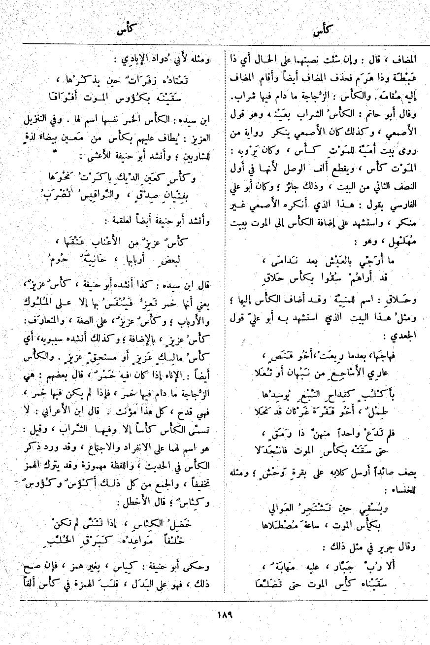 الْمُضَافَ، قَالَ: وإِن شِئْتَ نَصَبْتَهُمَا عَلَى الْحَالِ أَي ذَا عَبْطَة وَذَا هَرَم فَحَذَفَ الْمُضَافَ أَيضاً وأَقام الْمُضَافَ إِليه مُقامَه. والكأْس: الزُّجاجة مَا دَامَ فِيهَا شَرَابٌ. وَقَالَ أَبو حَاتِمٍ: الكأْسُ الشَّرَابُ بعَيْنه وَهُوَ قَوْلُ الأَصمعي، وَكَذَلِكَ كَانَ الأَصمعي يُنْكِرُ رِوَايَةَ مَنْ رَوَى بَيْتَ أُمَيَّة للمَوْتِ كأْس، وَكَانَ يَرْويه: المَوْت كأْس، وَيَقْطَعُ أَلف الْوَصْلِ لأَنها فِي أَول النِّصْفِ الثَّانِي مِنَ الْبَيْتِ، وَذَلِكَ جَائِزٌ؛ وَكَانَ أَبو عَلِيٍّ الْفَارِسِيُّ يَقُولُ: هَذَا الَّذِي أَنكره الأَصمعي غَيْرُ مُنْكَرٍ، وَاسْتَشْهَدَ عَلَى إِضافة الكأْس إِلى الْمَوْتِ بِبَيْتِ مُهَلْهِل، وَهُوَ: