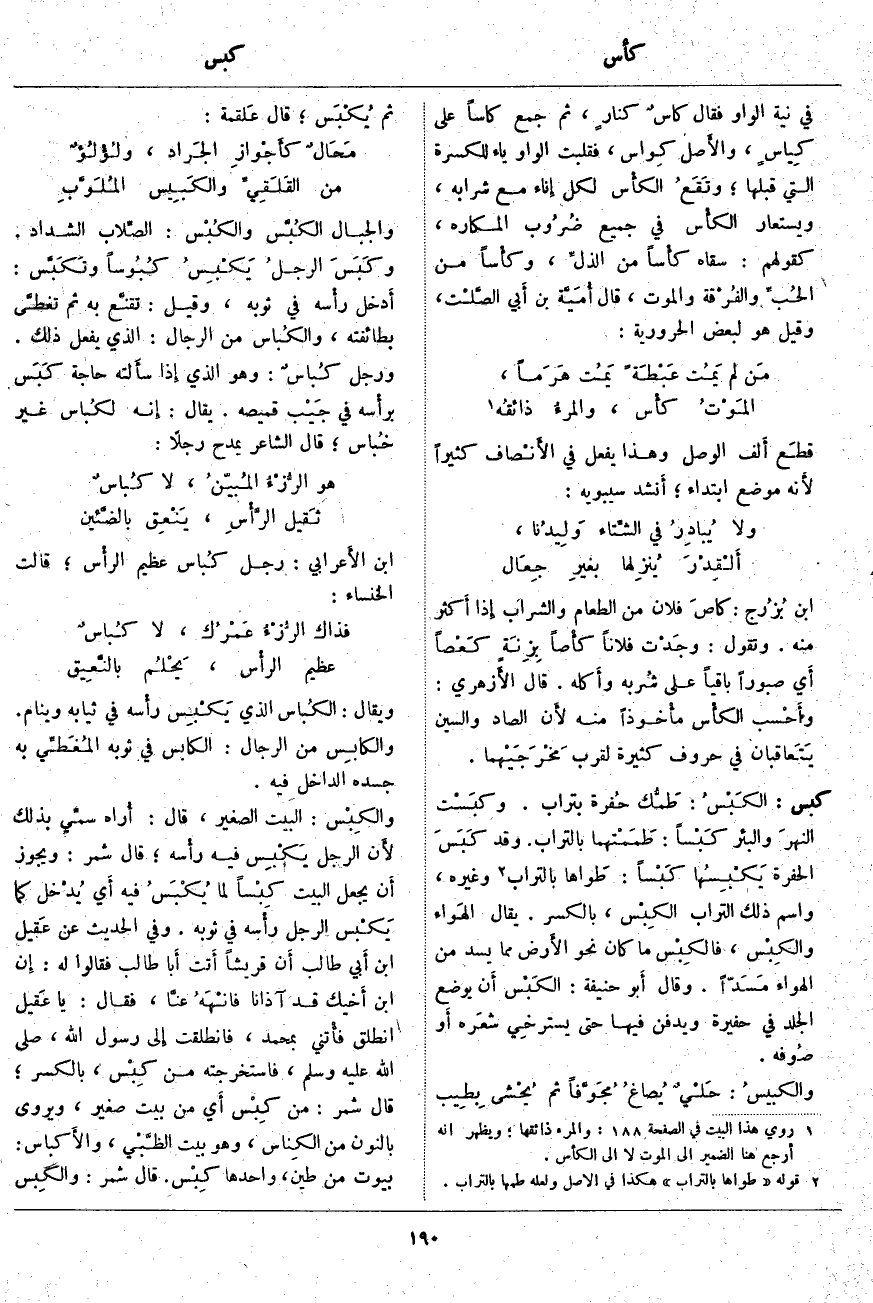 فِي نِيَّةِ الْوَاوِ فَقَالَ كاسٌ كنارٍ، ثُمَّ جَمَعَ كَأْسًا عَلَى كِياسٍ، والأَصل كِواس، فَقُلِبَتِ الْوَاوُ يَاءً لِلْكَسْرَةِ الَّتِي قَبْلَهَا؛ وتَقَعُ الكأْس لِكُلِّ إِناءٍ مَعَ شَرَابِهِ، وَيُسْتَعَارُ الكأْس فِي جَمِيعِ ضُرُوب الْمَكَارِهِ، كَقَوْلِهِمْ: سَقَاهُ كأْساً مِنَ الذلِّ، وكأْساً مِنَ الحُبِّ والفُرْقة وَالْمَوْتِ، قَالَ أُمَيَّة بْنُ أَبي الصَّلْت، وَقِيلَ هُوَ لِبَعْضِ الْحَرُورِيَّةِ: