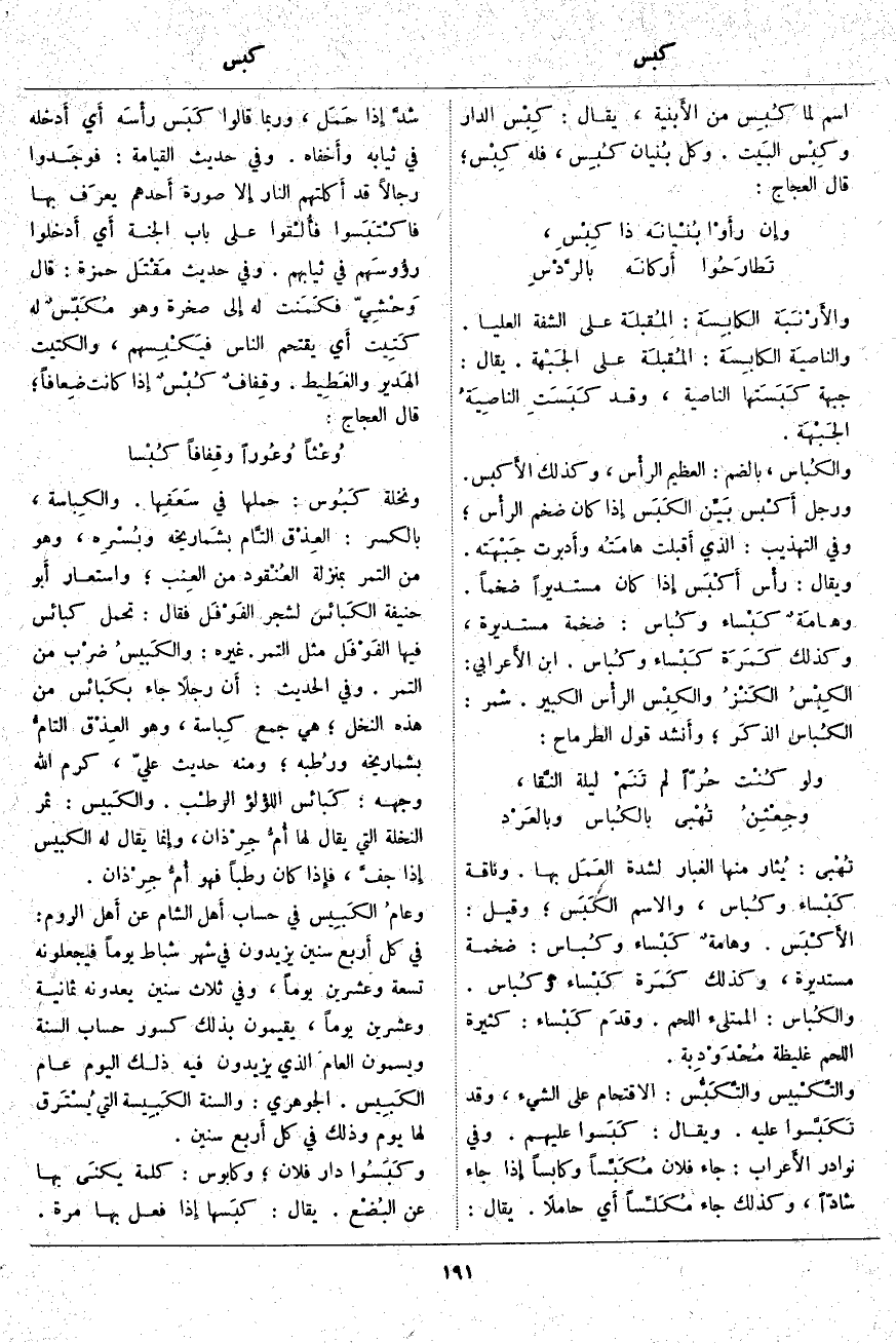 تُهْبى: يُثار مِنْهَا الْغُبَارُ لِشِدَّةِ العَمَل بِهَا، ناقة كَبْساء وكُباس، وَالِاسْمُ الكَبَس؛ وَقِيلَ: الأَكْبَس. وهامةٌ كَبْساء وكُباس: ضَخْمَةٌ مُسْتَدِيرَةٌ، وَكَذَلِكَ كَمَرة كَبْساء وَكُباس. والكُباس. الْمُمْتَلِئُ اللَّحْمِ. وقدَم كَبْساء: كَثِيرَةُ اللَّحْمِ غَلِيظَةٌ مُحْدَوْدِبة. والتَّكْبيس والتَّكَبُّس: الِاقْتِحَامُ عَلَى الشَّيْءِ، وَقَدْ تَكَبَّسوا عَلَيْهِ. وَيُقَالُ: كَبَسوا عَلَيْهِمْ. وَفِي نَوَادِرِ الأَعراب: جَاءَ فُلَانٌ مُكَبِّساً وَكَابِسًا إِذا جَاءَ شَادًّا، وَكَذَلِكَ جَاءَ مُكَلِّساً أَي حَامِلًا. يُقَالُ: شدَّ إِذا حَمَل، وَرُبَّمَا قَالُوا كَبَس رأْسَه أَي أَدخله فِي ثِيَابِهِ وأَخفاه. وَفِي حَدِيثِ الْقِيَامَةِ:
