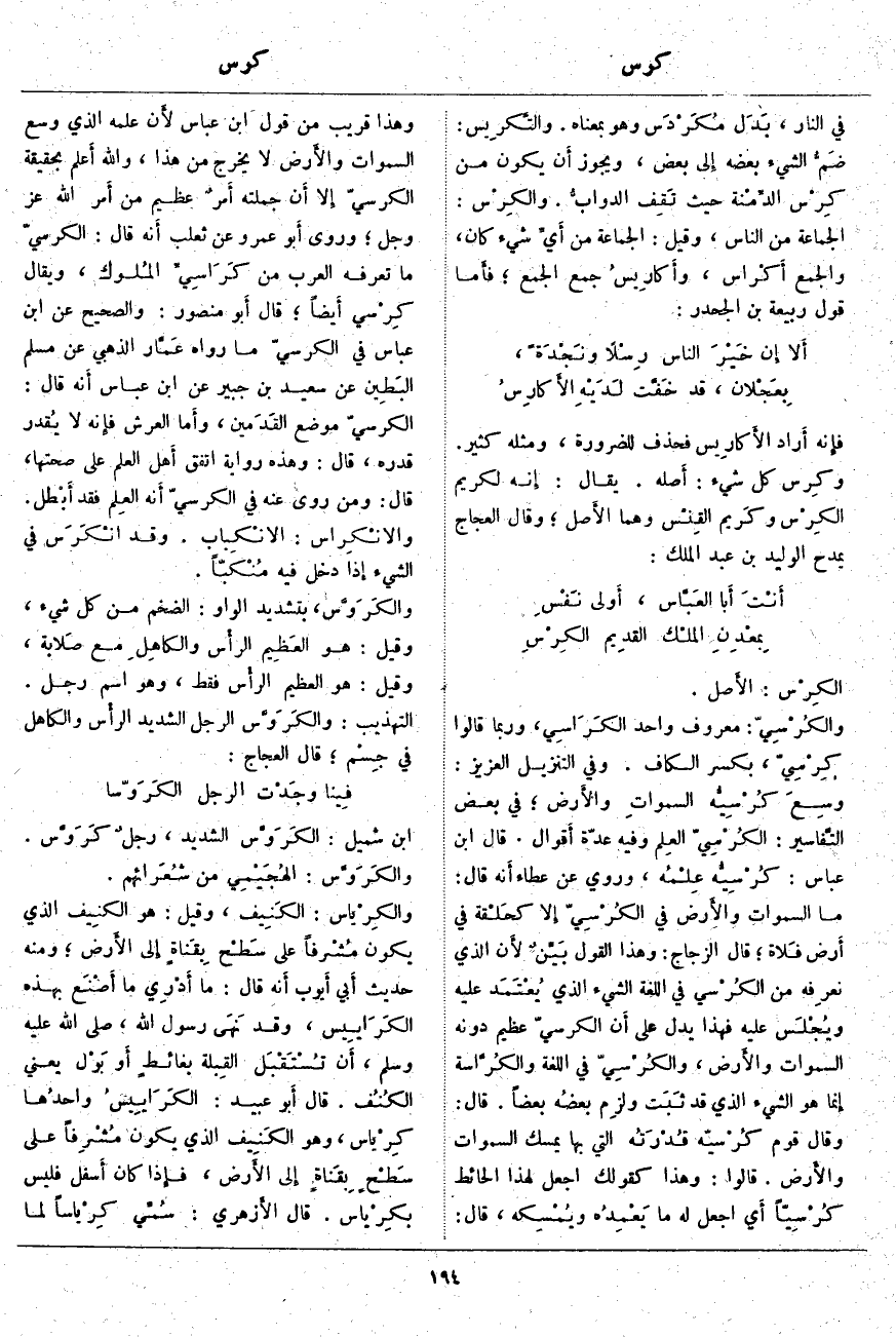 ؛ قَالَ الزَّجَّاجُ: وَهَذَا الْقَوْلُ بَيِّنٌ لأَن الَّذِي نعرِفه مِنَ الكُرْسي فِي اللُّغَةِ الشَّيْءُ الَّذِي يُعْتَمَد عَلَيْهِ ويُجْلَس عَلَيْهِ فَهَذَا يَدُلُّ عَلَى أَن الْكُرْسِيَّ عَظِيمٌ دونه السموات والأَرض، والكُرْسِيّ فِي اللُّغَةِ والكُرَّاسة إِنما هُوَ الشَّيْءُ الَّذِي قَدْ ثَبَت ولزِم بعضُه بَعْضًا. قَالَ: وَقَالَ قَوْمٌ كُرْسيّه قُدْرَتُه الَّتِي بها يمسك السموات والأَرض. قَالُوا: وَهَذَا كَقَوْلِكَ اجْعَلْ لِهَذَا الْحَائِطِ كُرْسِيّاً أَي اجْعَلْ لَهُ مَا يَعْمِدُه ويُمْسِكه، قَالَ: وَهَذَا قَرِيبٌ مِنْ قَوْلِ ابْنِ عَبَّاسٍ لأَن عِلْمَهُ الَّذِي وسع السموات والأَرض لَا يَخْرُجُ مِنْ هَذَا، واللَّه أَعلم بِحَقِيقَةِ الْكُرْسِيِّ إِلا أَن جُمْلَتَهُ أَمرٌ عَظِيمٌ مِنْ أَمر اللَّه عَزَّ وَجَلَّ؛ وَرَوَى أَبو عَمْرٍو عَنْ ثَعْلَبٍ أَنه قَالَ: الْكُرْسِيُّ مَا تَعْرِفُهُ الْعَرَبُ مِنْ كَرَاسِيِّ المُلوك، وَيُقَالُ كِرْسي أَيضاً؛ قَالَ أَبو مَنْصُورٍ: والصحيح عَنِ ابْنِ عَبَّاسٍ فِي الْكُرْسِيِّ مَا رَوَاهُ