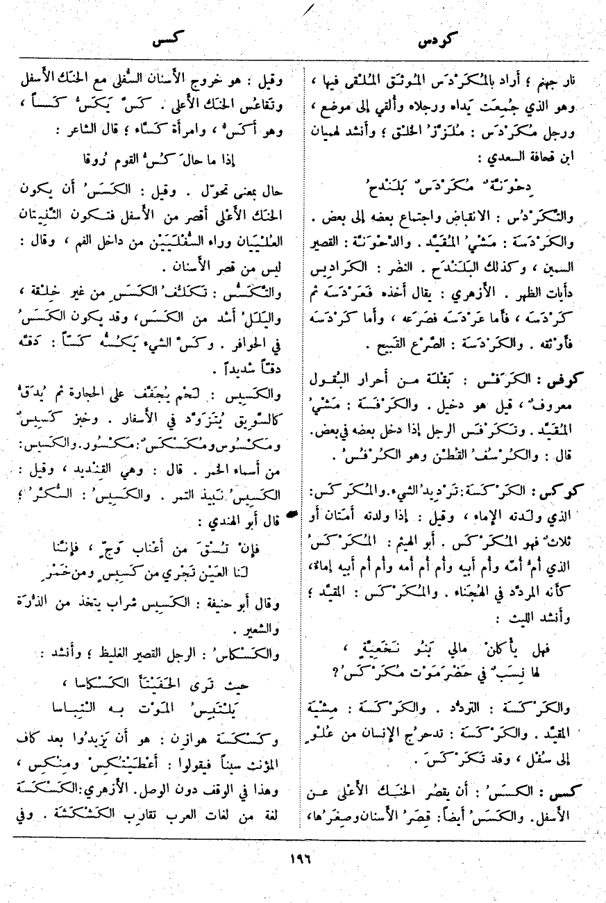 كسس: الكسَسُ: أَن يقصُر الحنَك الأَعْلى عَنِ الأَسفل. والكَسَسُ أَيضاً: قِصَرُ الأَسنان وصِغَرُها، وَقِيلَ: هُوَ خُرُوجُ الأَسنان السُّفلى مَعَ الحنَك الأَسفل وتَقاعُس الحنَك الأَعلى. كَسَّ يَكَسُّ كَسساً، وَهُوَ أَكَسُّ، وامرأَة كَسَّاء؛ قَالَ الشَّاعِرُ: