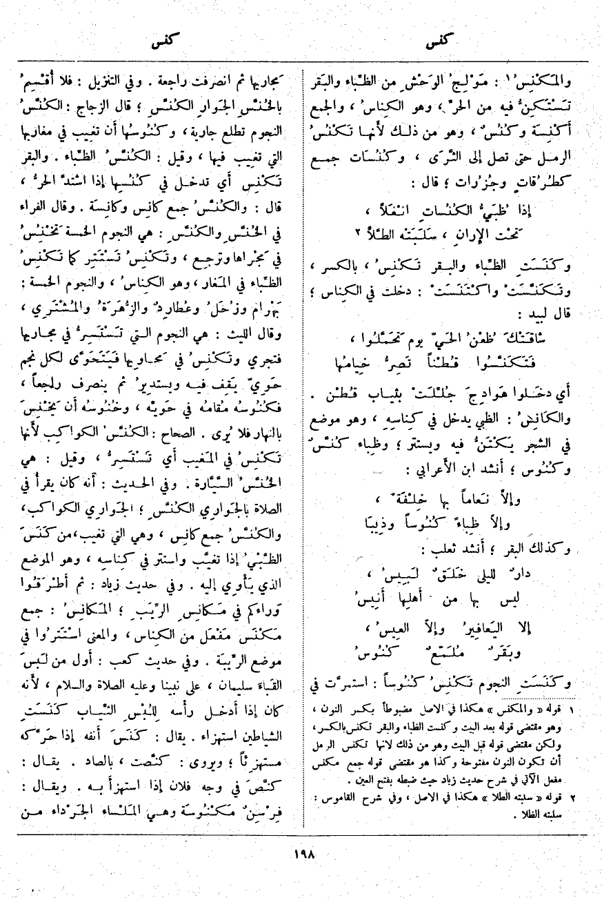 ؛ قَالَ الزَّجَّاجُ: الكُنَّسُ النُّجُومُ تَطْلُعَ جَارِيَةً، وكُنُوسُها أَن تَغِيبَ فِي مَغَارِبِهَا الَّتِي تغِيب فِيهَا، وَقِيلَ: الكُنَّسُ الظِّباء. وَالْبَقَرُ تَكْنِس أَي تَدْخُلُ فِي كُنُسِها إِذا اشتدَّ الحرُّ، قَالَ: والكُنَّسُ جَمْعُ كانِس وكانِسَة. وَقَالَ الْفَرَّاءُ فِي الخُنَّسِ والكُنَّسِ: هِيَ النُّجُومُ الْخَمْسَةُ تَخْنِسُ [تَخْنُسُ] فِي مَجْراها وترجِع، وتَكْنِسُ تَسْتَتِر كَمَا تَكْنِسُ الظِّباء فِي المَغار، وَهُوَ الكِناسُ، وَالنُّجُومُ الْخَمْسَةُ: بَهْرام وزُحَلُ وعُطارِدٌ والزُّهَرَةُ والمُشْتَرِي، وَقَالَ اللَّيْثُ: هِيَ النُّجُومُ الَّتِي تَسْتَسِرُّ فِي مَجَارِيهَا فَتَجْرِي وتَكْنِسُ فِي مَحاوِيها فَيَتَحَوَّى لِكُلِّ نَجْمٍ حَوِيّ يَقِف فِيهِ ويستدِيرُ ثُمَّ يَنْصَرِفُ رَاجِعًا، فكُنُوسُه مُقامُه فِي حَويِّه، وخُنُوسُه أَن يَخْنِسَ بِالنَّهَارِ فَلَا يُرى. الصِّحَاحُ: الكُنَّسُ الكواكِب لأَنها تَكْنِسُ فِي المَغيب أَي تَسْتَسِرُّ، وَقِيلَ: هِيَ الخُنَّسُ السَّيَّارة. وَفِي الْحَدِيثِ: