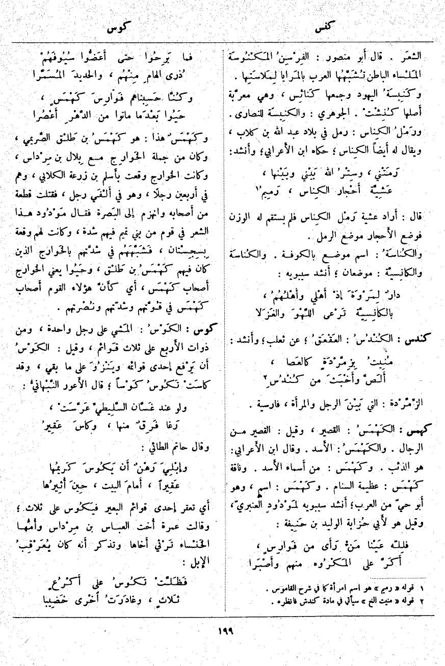 الشعَر. قَالَ أَبو مَنْصُورٍ: الفِرْسِنُ المَكْنُوسَة المَلْساء الْبَاطِنِ تُشَبِّهُها الْعَرَبُ بالمَرايا لِمَلاسَتِها. وكَنِيسَةُ الْيَهُودِ وَجَمْعُهَا كَنائِس، وَهِيَ معرَّبة أَصلها كُنِشْتُ. الْجَوْهَرِيُّ: والكنِيسَة لِلنَّصَارَى. ورَمْلُ الكِناس: رَمْلٌ فِي بِلَادِ عَبْدِ اللَّه بْنِ كِلَابٍ، وَيُقَالُ لَهُ أَيضاً الكِناس؛ حَكَاهُ ابْنُ الأَعرابي؛ وأَنشد: