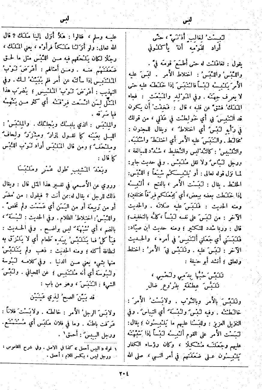 ؛ يُقَالُ: لَبَسْت الأَمر عَلَى الْقَوْمِ أَلْبِسُه لَبْساً إِذا شَبَّهْتَه عَلَيْهِمْ وجَعَلتَه مُشْكِلًا، وَكَانَ رُؤَسَاءُ الْكُفَّارِ يَلْبِسُون عَلَى ضَعَفَتهم فِي أَمر النَّبِيِّ، صَلَّى اللَّه عَلَيْهِ وَسَلَّمَ، فَقَالُوا: هَلَّا أُنزل إِلينا مَلَك؟ قَالَ اللَّه تَعَالَى: وَلَوْ أَنْزَلْنا مَلَكاً فرأَوْه، يَعْنِي المَلَك، رجُلًا لَكَانَ يَلْحَقهم فِيهِ مِنَ اللَّبْس مِثْلُ مَا لَحِقَ ضَعَفَتَهُم مِنْهُ. وَمِنْ أَمثالهم: أَعْرَضَ ثَوْبُ المُلْتَبِس إِذا سأَلتَه عَنْ أَمر فَلَمْ يُبَيِّنْهُ لَكَ. وَفِي التَّهْذِيبِ: أَعْرَضَ ثَوْبُ المُلْبِسِ؛ يُضرَب هَذَا المَثَل لِمَن اتَّسَعت فِرْقَتُه أَي كَثُرَ مَنْ يَتَّهِمُه فِيمَا سَرَقه. والمِلْبَس: الَّذِي يلبسُك ويُجلِّلك. والمِلْبَسُ: اللَّيْلُ بعَيْنه كَمَا تَقُولُ إِزارٌ ومِئْزَرٌ ولِحافٌ ومِلْحَفٌ؛ وَمَنْ قَالَ المَلْبَس أَراد ثَوْب اللُّبْس كَمَا قَالَ: