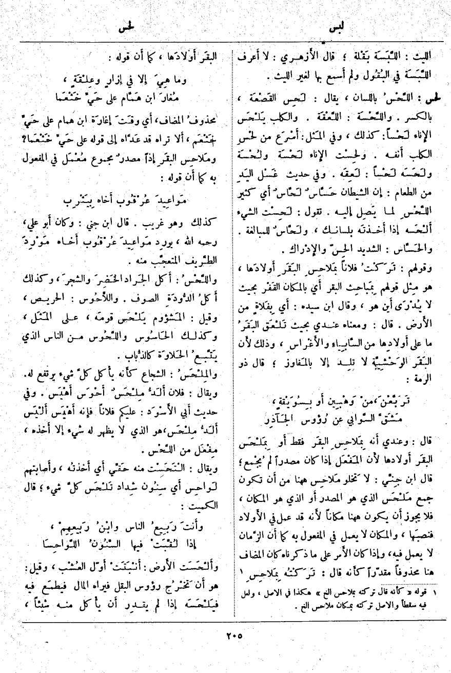 أَي كَثِيرُ اللَّحْسِ لِمَا يَصِل إِليه. تَقُولُ: لَحِسْت الشَّيْءَ أَلْحَسه إِذا أَخذتَه بِلِسَانِكَ، ولَحَّاسٌ لِلْمُبَالَغَةِ. والحَسَّاس: الشَّدِيدُ الحِسّ والإِدْراك. وَقَوْلُهُمْ: تَرَكْتُ فُلَانًا بمَلاحِسِ البَقَرِ أَولادَها، هُوَ مِثل قَوْلِهِمْ بِمَباحِث الْبَقَرِ أَي بِالْمَكَانِ القَفْر بِحَيْثُ لَا يُدْرَى أَين هُوَ، وَقَالَ ابْنُ سِيدَهْ: أَي بِفَلاةٍ مِنَ الأَرض. قَالَ: وَمَعْنَاهُ عِنْدِي بِحَيْثُ تَلْعَق البَقَرُ مَا عَلَى أَولادِها مِنَ السَّابِياءِ والأَغْراسِ، وَذَلِكَ لأَن البَقَر الوَحْشِيَّة لَا تلِد بالمَفاوز؛ قَالَ ذُو الرُّمَّةِ: