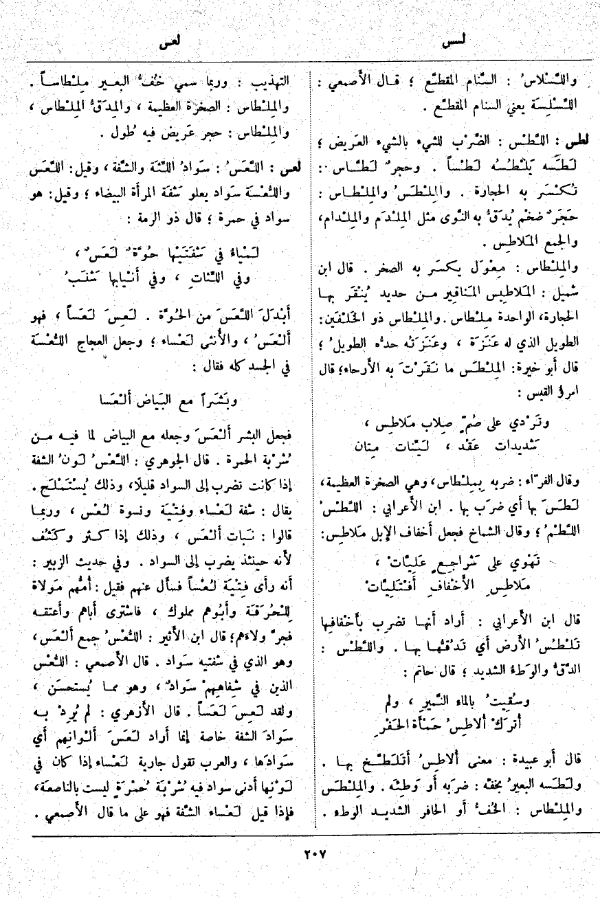 لطس: اللَّطْس: الضَّرْب لِلشَّيْءِ بِالشَّيْءِ العَريض؛ لَطَسه يَلْطُسُه لَطْساً. وحجرٌ لَطَّاس: تُكْسَر بِهِ الْحِجَارَةُ. والمِلْطَسُ والمِلْطاس: حَجَرٌ ضخْم يُدَقُّ بِهِ النَّوى مِثْلُ المِلْدَم والمِلْدام، وَالْجَمْعُ المَلاطِس. والمِلْطاس: مِعْوَل يكسَر بِهِ الصَّخْرُ. قَالَ ابْنُ شُمَيْلٍ: المَلاطِيس المَناقِير مِنْ حَدِيدٍ يُنْقَر بِهَا الْحِجَارَةُ، الْوَاحِدَةُ مِلْطاس. والمِلْطاس ذُو الخَلْفَين: الطَّوِيلُ الَّذِي لَهُ عَنَزَة، وعَنَزَتُه حدُّه الطويلُ؛ قَالَ أَبو خَيْرَةَ: المِلْطَس مَا نَقَرْتَ بِهِ الأَرحاء؛ قَالَ إمرؤْ الْقَيْسِ: