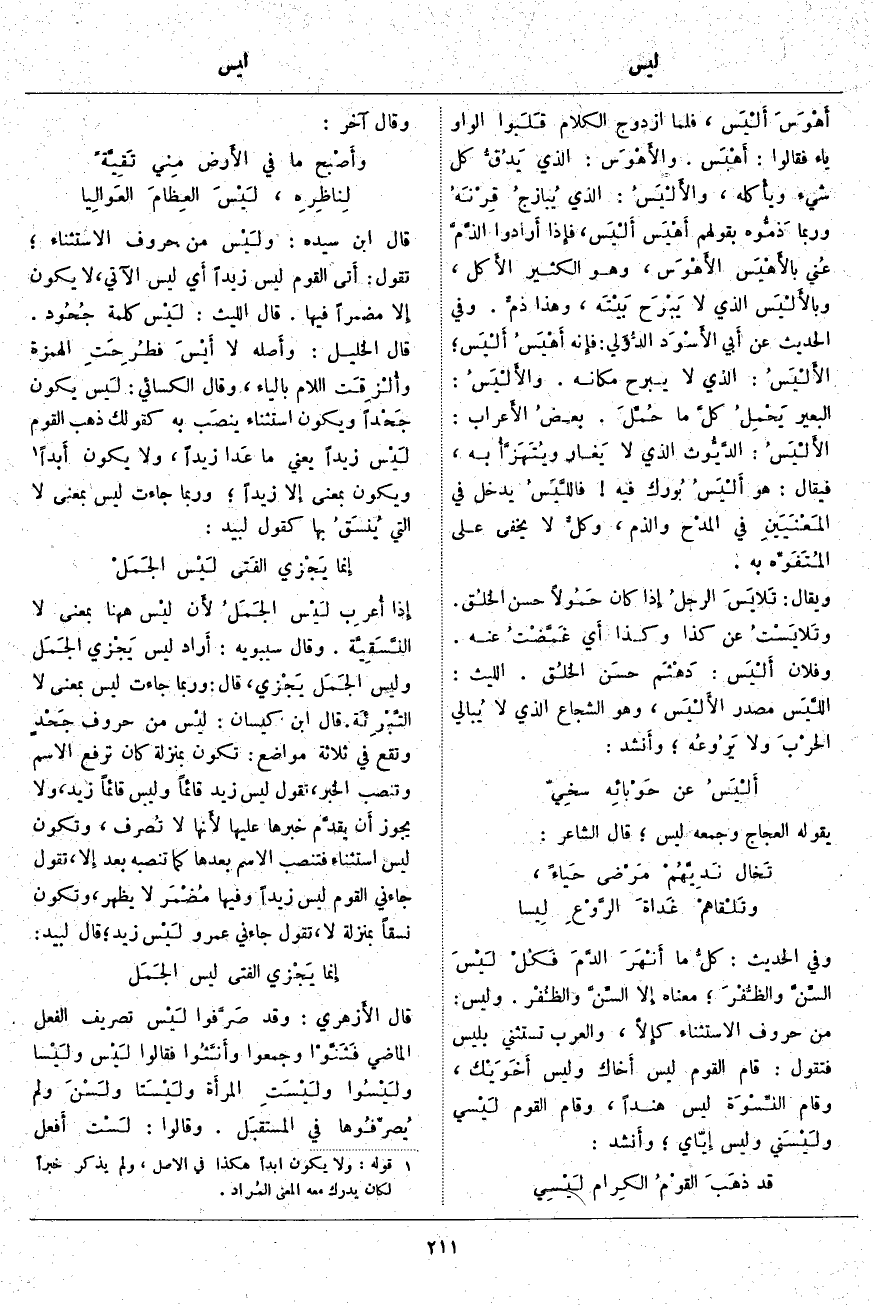 قَالَ ابْنُ سِيدَهْ: ولَيْس مِنْ حُرُوفِ الِاسْتِثْنَاءِ؛ تَقُولُ: أَتى الْقَوْمُ لَيْسَ زَيْدًا أَي لَيْسَ الْآتِي، لَا يَكُونُ إِلا مُضْمَرًا فِيهَا. قَالَ اللَّيْثُ: لَيْس كَلِمَةُ جُحُود. قَالَ الْخَلِيلُ: وأَصله لَا أَيْسَ فطُرِحَتِ الْهَمْزَةُ وأُلْزِقَت اللَّامُ بِالْيَاءِ، وَقَالَ الْكِسَائِيُّ: لَيس يَكُونُ جَحْداً وَيَكُونُ اسْتِثْنَاءً ينصَب بِهِ كَقَوْلِكَ ذَهَبَ الْقَوْمُ لَيْس زَيْدًا يَعْنِي مَا عَدا زَيْدًا، وَلَا يَكُونُ أَبداً «2» وَيَكُونُ بِمَعْنَى إِلا زَيْدًا؛ وَرُبَّمَا جَاءَتْ لَيْسَ بِمَعْنَى لَا الَّتِي يُنسَقُ بِهَا كَقَوْلِ لَبِيدٍ:
