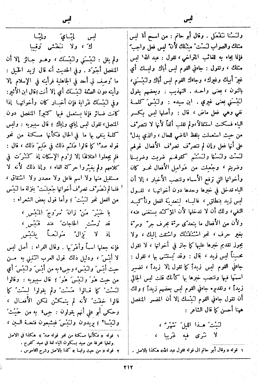 فإِنه جَعَلَهَا اسْمًا وأَعْرَبها. وَقَالَ الْفَرَّاءُ: أَصل لَيْسَ لَا أَيْسَ، وَدَلِيلُ ذَلِكَ قَوْلُ الْعَرَبِ ائتِنِي بِهِ مِنْ حَيْثُ أَيْسَ ولَيْس، وجِئْ بِهِ مِنْ أَيْسَ ولَيْسَ أَي مِنْ حَيْثُ هُوَ ولَيْسَ هُوَ؛ قَالَ سِيبَوَيْهِ: وَقَالُوا لَسْتُ كَمَا قَالُوا مَسْتُ وَلَمْ يَقُولُوا لِسْتُ كَمَا قَالُوا خِفْتُ لأَنه لَمْ يتمكَّن تَمَكُّنَ الأَفعال، وَحَكَى أَبو عَلِيٍّ أَنهم يقولون: جِئْ بِهِ مِنْ حَيْثُ ولَيْسا «3»؛ يُرِيدُونَ ولَيْسَ فَيُشْبِعُونَ فَتْحَةَ السين،