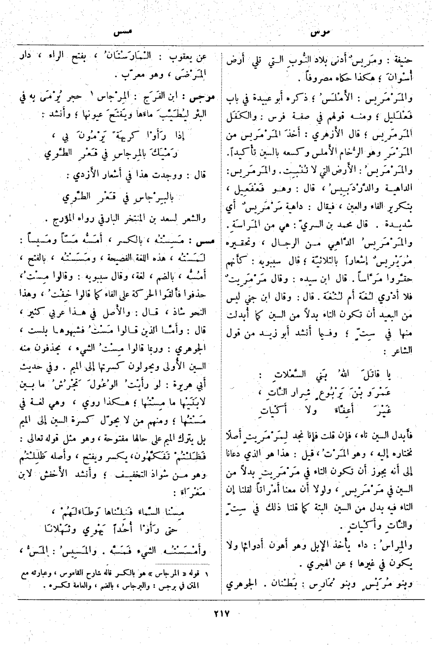 فأَبدل السِّينَ تَاءً، فإِن قُلْتَ فإِنا نَجِدُ لِمَرْمَرِيتٍ أَصلًا نَخْتَارُهُ إِليه، وَهُوَ المَرْتُ، قِيلَ: هَذَا هُوَ الَّذِي دَعَانَا إِلى أَنه يَجُوزُ أَن تَكُونَ التَّاءُ فِي مَرْمَرِيتٍ بَدَلًا مِنَ السِّينِ فِي مَرْمَرِيسٍ، وَلَوْلَا أَن مَعَنَا أَمْراتاً لَقُلْنَا إِن التَّاءَ فِيهِ بَدَلٌ مِنَ السِّينِ أَلْبَتَّةَ كَمَا قُلْنَا ذَلِكَ فِي سِتٍّ والنَّاتِ وأَكْياتٍ. والمِراسُ: دَاءٌ يأْخذ الإِبل وَهُوَ أَهون أَدوائها وَلَا يَكُونُ فِي غَيْرِهَا؛ عَنِ الْهَجَرِيِّ. وَبَنُو مُرَيْسٍ وَبَنُو مُمَارِس: بَطْنان. الْجَوْهَرِيُّ عَنْ يَعْقُوبَ: الْمَارَسْتَانُ، بِفَتْحِ الرَّاءِ، دَارُ المَرْضَى، وَهُوَ معرّب.