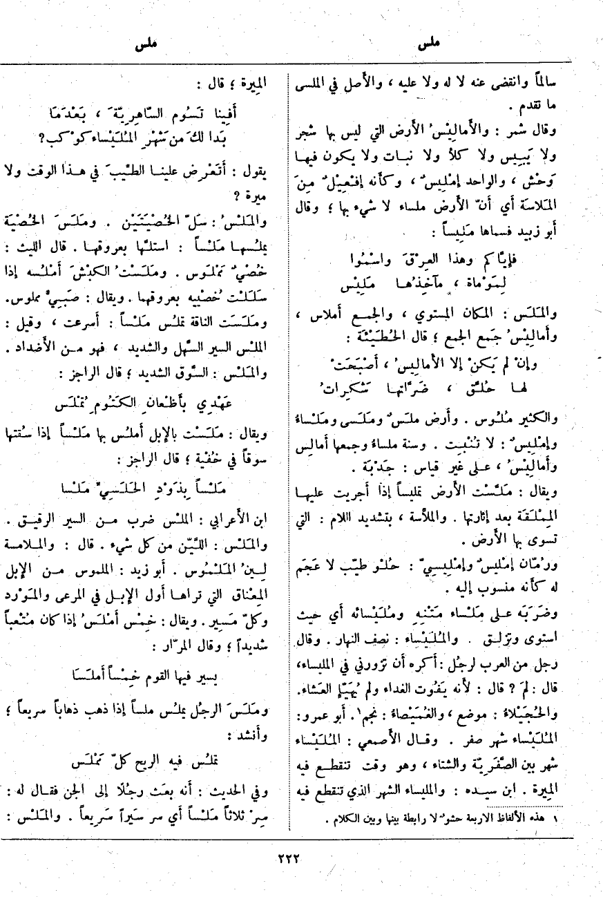 وَالْكَثِيرُ مُلُوس. وأَرض ملَسٌ ومَلَسى ومَلْساءُ وإِمْلِيسٌ: لَا تُنْبِت. وَسَنَةٌ ملساءُ وَجَمْعُهَا أَمالِس وأَمالِيْسُ، عَلَى غَيْرِ قِيَاسٍ: جَدْبَة. وَيُقَالُ: مَلَّسْت الأَرض تَمْلِيسًا إِذا أَجريت عَلَيْهَا المِمْلَقَة بَعْدَ إِثارتها. والملَّاسة، بِتَشْدِيدِ اللَّامِ: الَّتِي تُسَوَّى بِهَا الأَرض. ورُمّان إِمْليسٌ وإِمْلِيسِيّ: حُلْو طَيِّبٌ لَا عَجَم لَهُ كأَنه مَنْسُوبٌ إِليه. وضَرَبَه عَلَى مَلْساء مَتْنِهِ ومُلَيْسائه أَي حَيْثُ اسْتَوَى وَتَزَلَّقَ. والمُلَيْساء: نِصْفُ النَّهَارِ. وَقَالَ رَجُلٌ مِنَ الْعَرَبِ لرجُل: أَكره أَن تَزُورَنِي فِي الْمُلَيْسَاءِ، قَالَ: لمَ؟ قَالَ: لأَنه يَفُوت الْغَدَاءُ وَلَمْ يُهَيّإِ العَشاء. والحُجَيْلاءُ: مَوْضِعٌ، والغُمَيْصاءُ: نَجْمٌ «2». أَبو عَمْرٍو: المُلَيْساء شَهْرُ صَفَرَ. وَقَالَ الأَصمعي: المُلَيْساء شَهْرٌ بَيْنَ الصَّفَرِيّة وَالشِّتَاءِ، وَهُوَ وَقْتٌ تَنْقَطِعُ فِيهِ المِيرة. ابْنُ سِيدَهْ: وَالْمُلَيْسَاءُ الشَّهْرُ الَّذِي تَنْقَطِعُ فِيهِ المِيرة؛ قَالَ: