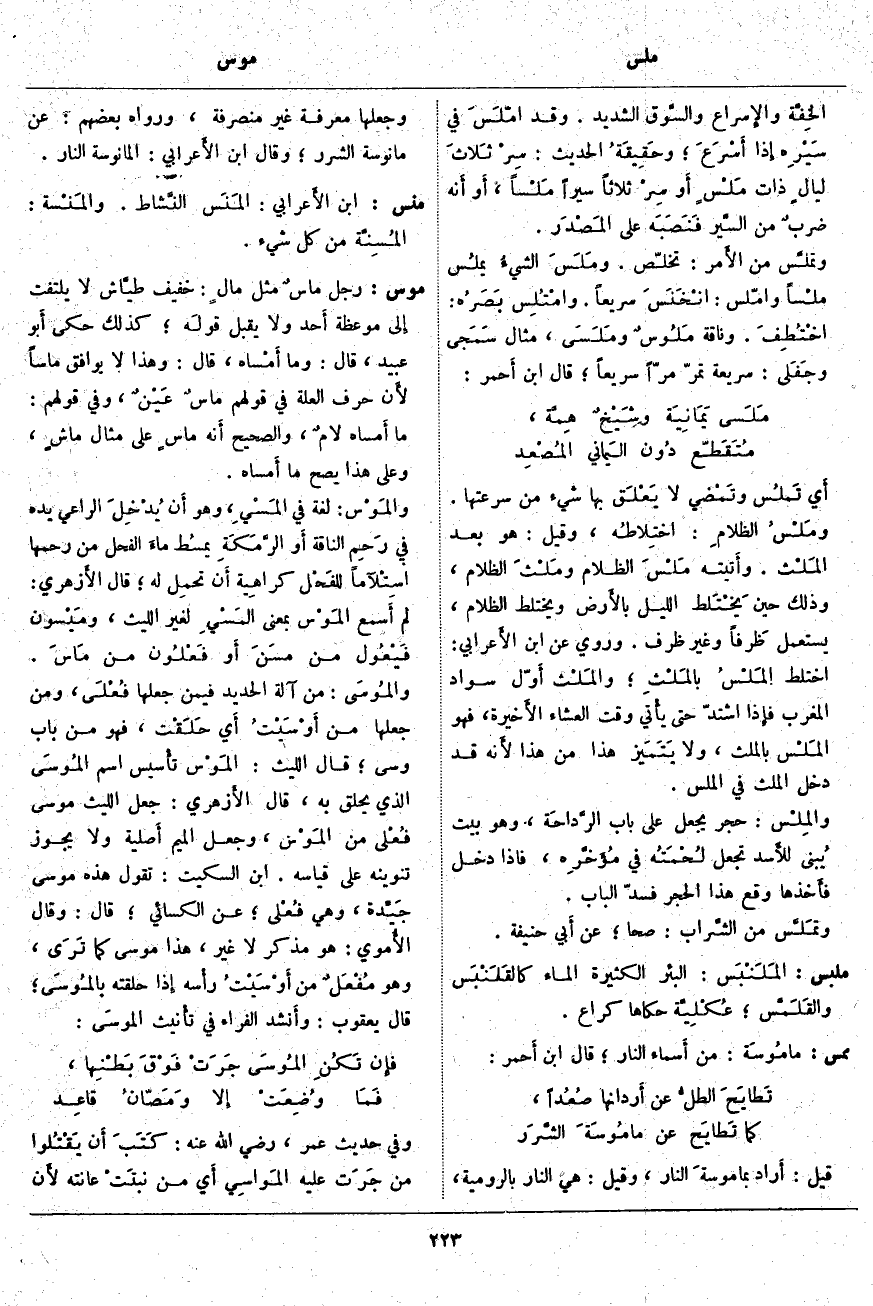 موس: رَجُلٌ ماسٌ مِثْلُ مالٍ: خَفِيفٌ طيَّاش لَا يَلْتَفِتُ إِلى مَوْعِظَةِ أَحد وَلَا يَقْبَلُ قولَه؛ كَذَلِكَ حَكَى أَبو عُبَيْدٍ، قَالَ: وَمَا أَمْساه، قَالَ: وَهَذَا لَا يُوَافِقُ مَاسًا لأَن حَرْفَ الْعِلَّةِ فِي قَوْلِهِمْ ماسٌ عَيْنٌ، وَفِي قَوْلِهِمْ: مَا أَمساه لامٌ، وَالصَّحِيحُ أَنه ماسٍ عَلَى مِثَالِ ماشٍ، وَعَلَى هَذَا يَصِحُّ مَا أَمساه. والمَوْس: لُغَةٌ فِي المَسْيِ، وَهُوَ أَن يُدْخِلَ الرَّاعِي يَدَهُ فِي رَحِم النَّاقَةِ أَو الرَّمَكَةِ يمسُط ماءَ الْفَحْلِ مِنْ رَحِمِهَا اسِتْلآماً للفَحْل كراهِية أَن تحمِل لَهُ؛ قَالَ الأَزهري: لَمْ أَسمع المَوْس بِمَعْنَى المَسْيِ لِغَيْرِ اللَّيْثِ، ومَيْسون فَيْعُول مِنْ مسَنَ أَو فَعْلُون مِنْ مَاسَ. والمُوسَى: مِنْ آلَةِ الْحَدِيدِ فِيمَنْ جَعَلَهَا فُعْلَى، وَمَنْ جَعَلَهَا مِنْ أَوْسَيْتُ أَي حَلَقْت، فَهُوَ مِنْ بَابِ وَسَى؛ قَالَ اللَّيْثُ: المَوْس تأْسيس اسْمِ المُوسَى الَّذِي يُحْلَقُ بِهِ، قَالَ الأَزهري: جَعَلَ اللَّيْثُ مُوسَى فُعْلى مِنَ المَوْس، وَجَعَلَ الْمِيمَ أَصلية وَلَا يَجُوزُ تَنْوِينُهُ عَلَى قِيَاسِهِ. ابْنُ السِّكِّيتِ: تَقُولُ هَذِهِ مُوسَى جَيِّدة، وَهِيَ فُعْلى؛ عَنِ الْكِسَائِيِّ؛ قَالَ: وَقَالَ الأُموي: هُوَ مُذَكَّرٌ لَا غَيْرُ، هَذَا مُوسَى كَمَا تَرَى، وَهُوَ مُفْعَلٌ مِنْ أَوْسَيْتُ رأْسه إِذا حَلَقْتَهُ بالمُوسَى؛ قَالَ يَعْقُوبُ: وأَنشد الْفَرَّاءُ فِي تأْنيث الموسَى: