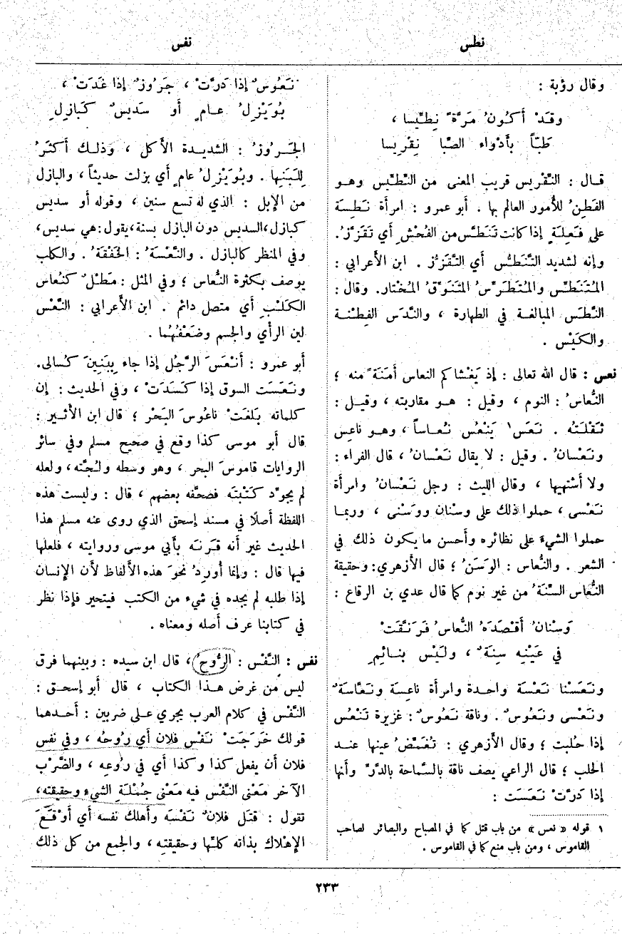 نفس: النَّفْس: الرُّوحُ، قَالَ ابْنُ سِيدَهْ: وَبَيْنَهُمَا فَرْقٌ لَيْسَ مِنْ غَرَضِ هَذَا الكتاب، قال أَبو إِسحق: النَّفْس فِي كَلَامِ الْعَرَبِ يَجْرِي عَلَى ضَرْبَيْنِ: أَحدهما قَوْلُكَ خَرَجَتْ نَفْس فُلَانٍ أَي رُوحُه، وَفِي نَفْس فُلَانٍ أَن يَفْعَلَ كَذَا وَكَذَا أَي فِي رُوعِه، والضَّرْب الْآخَرُ مَعْنى النَّفْس فِيهِ مَعْنى جُمْلَةِ الشَّيْءِ وَحَقِيقَتِهِ، تَقُولُ: قتَل فلانٌ نَفْسَه وأَهلك نَفْسَه أَي أَوْقَعَ الإِهْلاك بِذَاتِهِ كلِّها وحقيقتِه، وَالْجَمْعُ مِنْ كُلِّ ذَلِكَ
