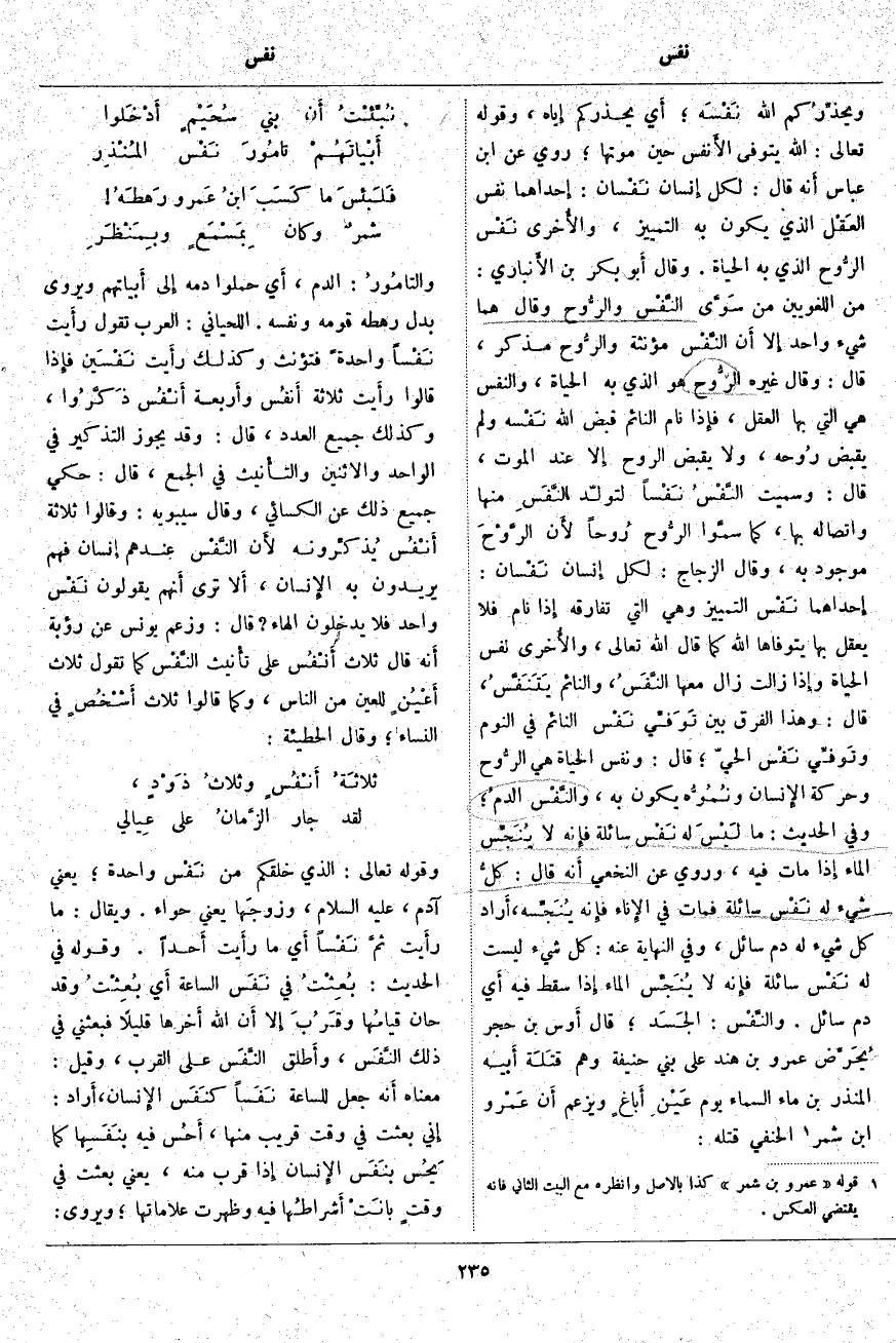 ابْنِ عَبَّاسٍ أَنه قَالَ: لِكُلِّ إِنْسَانٍ نَفْسان: إِحداهما نَفْس العَقْل الَّذِي يَكُونُ بِهِ التَّمْيِيزُ، والأُخرى نَفْس الرُّوح الَّذِي بِهِ الْحَيَاةُ.