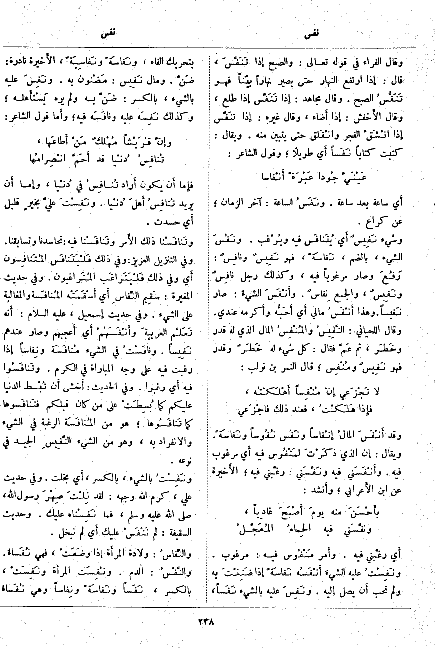 فإِما أَن يَكُونَ أَراد تُنافِسُ فِي دُنْيا، وإِما أَن يُرِيدَ تُنافِسُ أَهلَ دُنْيا. ونَفِسْتَ عليَّ بخيرٍ قَلِيلٍ أَي حَسَدْتَ. وتَنافَسْنا ذَلِكَ الأَمر وتَنافَسْنا فِيهِ: تَحَاسَدْنَا وَتَسَابَقْنَا. وَفِي التَّنْزِيلِ الْعَزِيزِ: وَفِي ذلِكَ فَلْيَتَنافَسِ الْمُتَنافِسُونَ