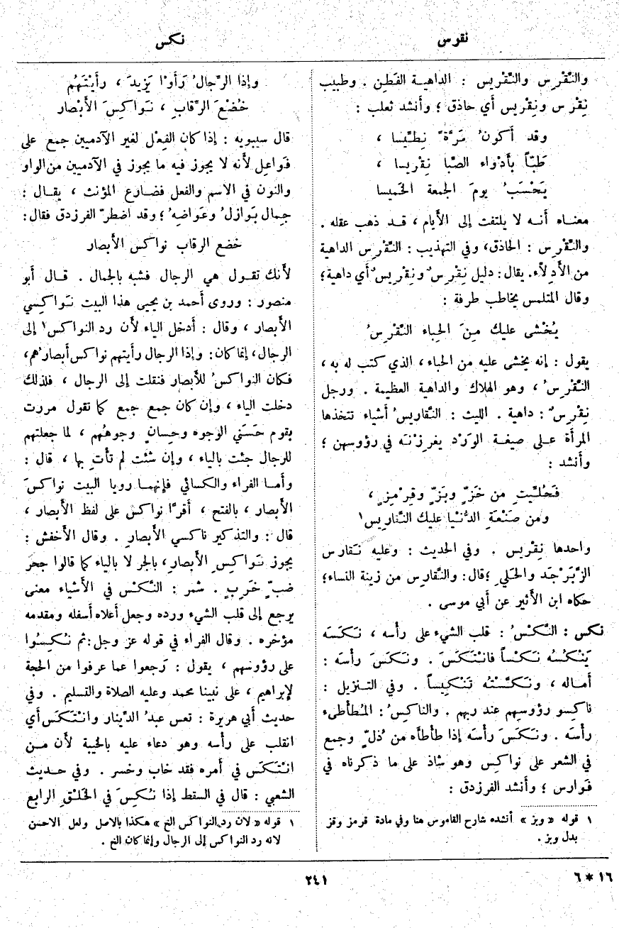 لأَنك تَقُولُ هِيَ الرِّجَالُ فَشَبَّهَ بِالْجِمَالِ. قَالَ أَبو مَنْصُورٍ: وَرَوَى أَحمد بْنُ يَحْيَى هَذَا الْبَيْتَ نَواكِسي الأَبصار، وَقَالَ: أَدخل الْيَاءَ لأَن رَدَّ النَّوَاكِسِ «4» إِلى الرِّجَالِ، إِنما كَانَ: وإِذا الرِّجَالُ رأَيتهم نَوَاكِسَ أَبصارُهم، فَكَانَ النواكسُ للأَبصار فَنُقِلَتْ إِلى الرِّجَالِ، فَلِذَلِكَ دَخَلَتِ الْيَاءُ، وإِن كَانَ جَمْعُ جَمْعٍ كَمَا تَقُولُ مَرَرْتُ بِقَوْمٍ حَسَني الْوُجُوهِ وحِسانٍ وجوهُهم، لَمَّا جَعَلْتَهُمْ لِلرِّجَالِ جِئْتَ بِالْيَاءِ، وإِن شِئْتَ لَمْ تأْتِ بِهَا، قَالَ: وأَما الْفَرَّاءُ وَالْكِسَائِيُّ فإِنهما رَوَيَا الْبَيْتَ نواكسَ الأَبصار، بِالْفَتْحِ، أَقرَّا نَوَاكِسَ عَلَى لَفْظِ الأَبصار، قَالَ: وَالتَّذْكِيرُ نَاكِسِي الأَبصارِ. وَقَالَ الأَخفش: يَجُوزُ نَواكِسِ الأَبصارِ، بِالْجَرِّ لَا بِالْيَاءِ كَمَا قَالُوا جُحْرُ ضبٍّ خَرِبٍ. شَمِرٌ: النَكْس فِي الأَشياء مَعْنًى يَرْجِعُ إِلى قَلْبِ الشَّيْءِ وَرَدِّهِ وَجَعْلِ أَعلاه أَسفله وَمُقَدَّمَهُ مُؤَخَّرَهُ. وَقَالَ الْفَرَّاءُ فِي قَوْلِهِ عَزَّ وَجَلَّ: ثُمَّ نُكِسُوا عَلى رُؤُسِهِمْ