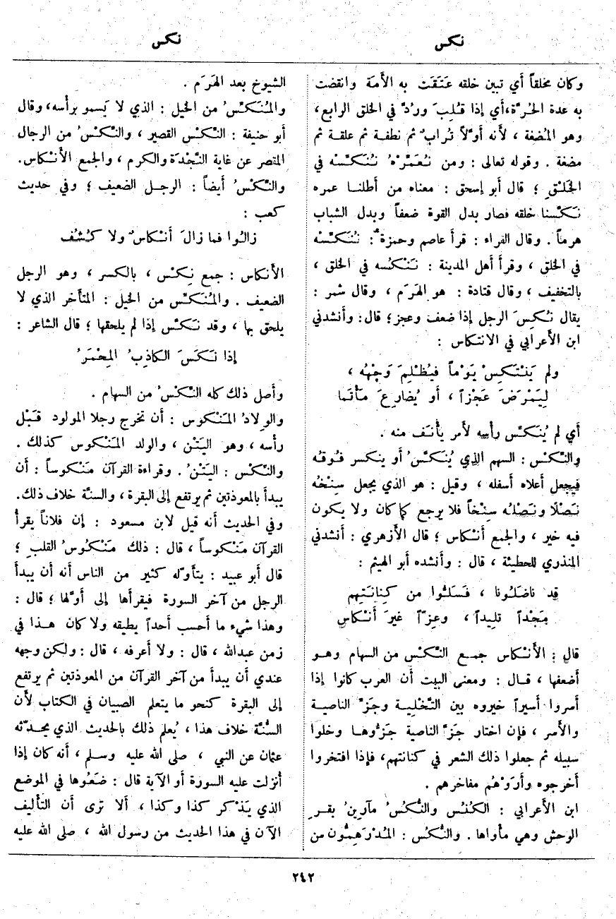 وأَصل ذَلِكَ كُلِّهِ النِّكْسُ مِنَ السِّهَامِ. والوِلادُ المَنْكوس: أَن تَخْرُجَ رِجْلَا الْمَوْلُودِ قَبْل رأْسه، وَهُوَ اليَتْن، وَالْوَلَدُ المَنْكوس كَذَلِكَ. والنِّكْس: اليَتْنُ. وَقِرَاءَةُ الْقُرْآنِ مَنْكوساً: أَن يبدأَ بِالْمُعَوِّذَتَيْنِ ثُمَّ يَرْتَفِعَ إِلى الْبَقَرَةِ، والسنَّة خِلَافُ ذَلِكَ. وَفِي الْحَدِيثِ