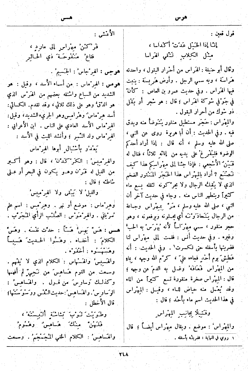 ؛ قَالَ: هُوَ شَجَرٌ أَو بَقْل ذُو شَوْكٍ مِنْ أَحرار الْبُقُولِ. والمِهْراس: حَجَر مُسْتَطِيلٌ مَنْقُورٌ يُتَوضأُ مِنْهُ وَيُدَقُّ فِيهِ. وَفِي الْحَدِيثِ: