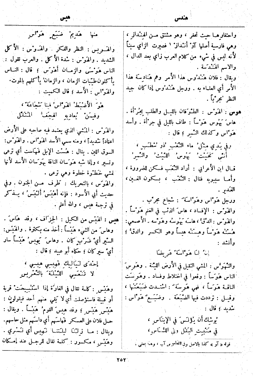 هوس: الهَوْس: الطَّوَفان بِاللَّيْلِ وَالطَّلَبُ بِجُرْأَة. هاسَ يَهُوس هَوْساً: طَافَ بِاللَّيْلِ فِي جرْأَة. وأَسد هَوَّاس وَكَذَلِكَ النَّمِر؛ قَالَ: