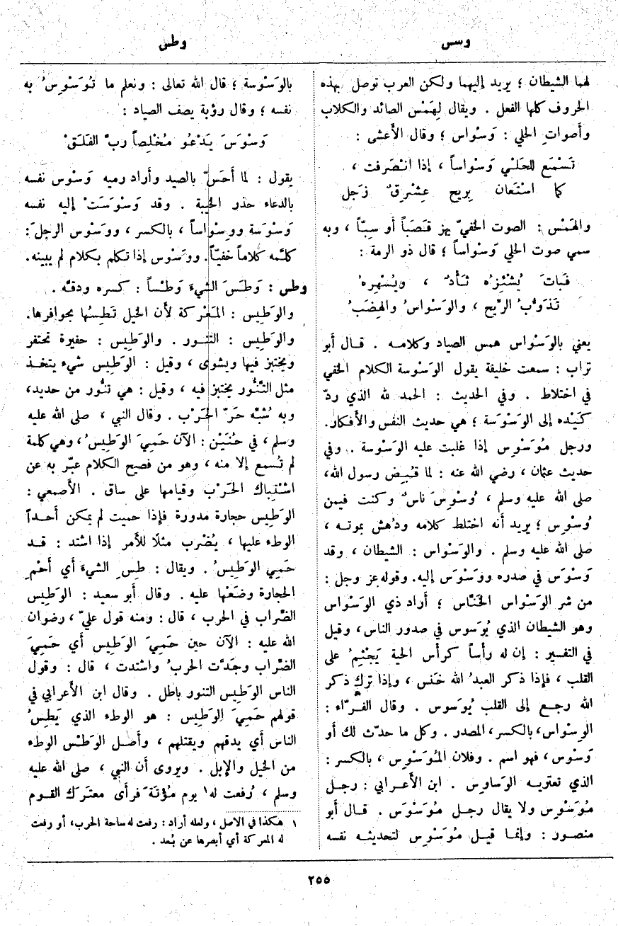 يَقُولُ: لَمَّا أَحَسَّ بِالصَّيْدِ وأَراد رَمْيَهُ وَسْوَسَ نَفْسَهُ بِالدُّعَاءِ حَذَرَ الْخَيْبَةِ. وَقَدْ وَسْوَسَتْ إِليه نَفْسُهُ وَسْوَسة ووِسْواساً، بِالْكَسْرِ، ووَسْوس الرجلَ: كلَّمه كَلَامًا خَفِيًّا. ووَسْوس إِذا تَكَلَّمَ بِكَلَامٍ لم يبينه.