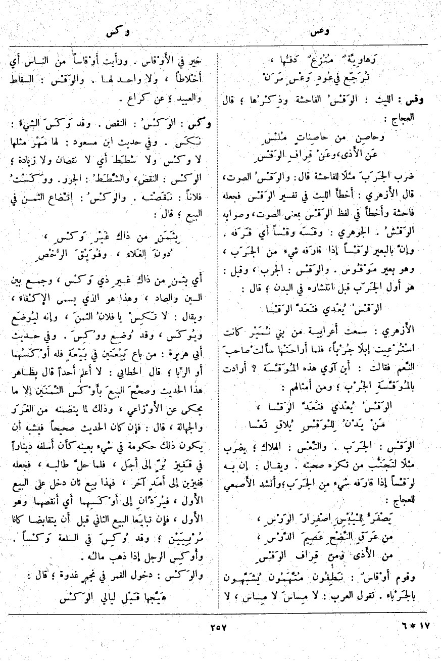 وَقَسَ: اللَّيْثُ: الوَقْسُ الْفَاحِشَةُ وذِكْرُها؛ قَالَ الْعَجَّاجُ: