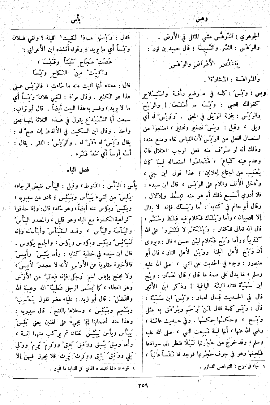 وَيَسَ: وَيْسُ: كَلِمَةٌ فِي مَوْضِعِ رأْفة واسْتِمْلاحٍ كَقَوْلِكَ لِلصَّبِيِّ: وَيْسَه مَا أَمْلَحَه والوَيْح والوَيْس: بِمَنْزِلَةِ الوَيْل فِي الْمَعْنَى. وَوَيْسٌ لَهُ أَي وَيْلٌ، وَقِيلَ: وَيْسٌ تَصْغِيرٌ وَتَحْقِيرٌ، امْتَنَعُوا مِنَ اسْتِعْمَالِ الْفِعْلِ مِنَ الوَيْس لأَن الْقِيَاسَ نَفَاهُ وَمَنَعَ مِنْهُ، وَذَلِكَ أَنه لَوْ صُرِّف مِنْهُ فِعْلٌ لَوَجَبَ اعْتِلَالُ فَائِهِ وَعَدَمِ عَيْنِهِ كَباعَ، فَتَحامَوا اسْتِعْمَالَهُ لِمَا كان يُعْقِب من اجتماع إِعلالين؛ هَذَا قَوْلُ ابْنِ جِنِّي، وأَدخل الأَلف وَاللَّامَ عَلَى الوَيْس، قَالَ ابْنُ سِيدَهْ: فَلَا أَدري أَسَمِع ذَلِكَ أَم هُوَ مِنْهُ تبسُّط وإِدْلال. وَقَالَ أَبو حَاتِمٍ فِي كِتَابِهِ: أَما وَيْسَك فإِنه لَا يُقَالُ إِلا لِلصِّبْيَانِ، وأَما وَيْلَك فَكَلَامٌ فِيهِ غِلَظ وشَتْم، قَالَ اللَّه تَعَالَى لِلْكُفَّارِ، وَيْلَكُمْ لَا تَفْتَرُوا عَلَى اللَّهِ كَذِباً؛ وأَما وَيْح فَكَلَامٌ ليِّن حَسَنٌ، قَالَ: وَيُرْوَى أَن وَيْح لأَهل الْجَنَّةِ ووَيْل لأَهل النَّارَ، قَالَ أَبو مَنْصُورٍ: وَجَاءَ فِي الْحَدِيثِ عَنِ