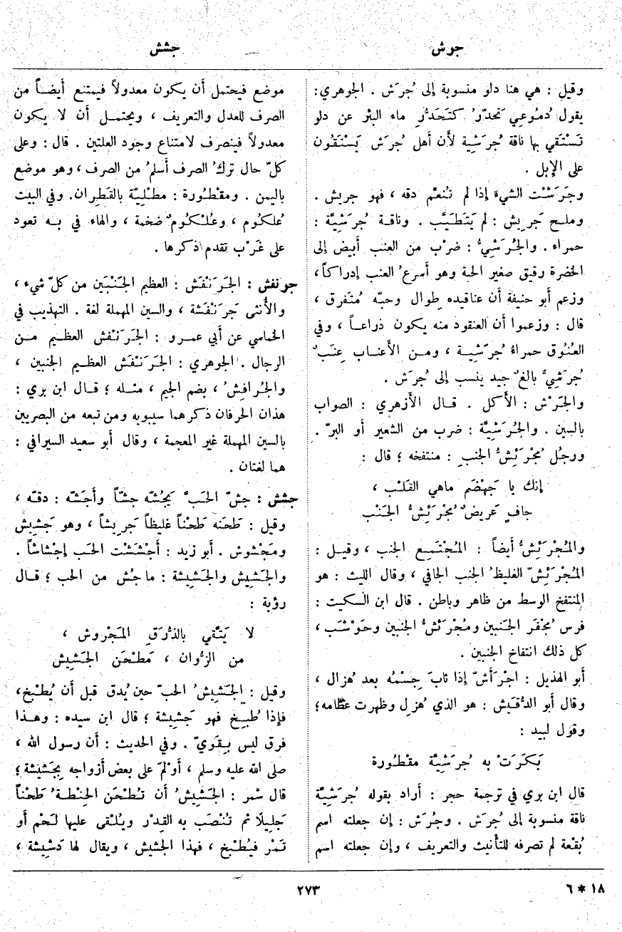 وَقِيلَ: هِيَ هُنَا دَلْوٌ مَنْسُوبَةٌ إِلى جُرَش. الْجَوْهَرِيُّ: يَقُولُ دُمُوعِي تَحدّرُ كتَحَدُّرِ مَاءِ الْبِئْرِ عَنْ دَلْوٍ تَسْتَقي بِهَا نَاقَةٌ جُرَشِية لأَن أَهل جُرَش يَسْتَقُون عَلَى الإِبل. وجَرَشْت الشيءَ إِذا لَمْ تُنعِّم دَقَّهُ، فَهُوَ جَرِيشٌ. وَمِلْحٌ جَرِيش: لَمْ يَتَطَيَّب. وَنَاقَةٌ جُرَشِيَّة: حَمْرَاءُ. والجُرَشِيُّ: ضرْب مِنَ الْعِنَبِ أَبيض إِلى الْخُضْرَةِ رَقِيقٌ صَغِيرُ الْحَبَّةِ وَهُوَ أَسرعُ الْعِنَبِ إِدراكاً، وَزَعَمَ أَبو حَنِيفَةَ أَن عَنَاقِيدَهُ طِوال وَحَبَّهُ مُتَفرق، قَالَ: وَزَعَمُوا أَن الْعُنْقُودَ مِنْهُ يَكُونُ ذِرَاعًا، وَفِي العُنُوق حمراءُ جُرَشِية، وَمِنَ الأَعناب عِنَبٌ جُرَشِيٌّ بالغٌ جَيِّدٌ يُنْسَبُ إِلى جُرَش. والجَرْش: الأَكل. قَالَ الأَزهري: الصَّوَابُ بِالسِّينِ. والجُرَشِيَّة: ضَرْبٌ مِنَ الشَّعِيرِ أَو الْبُرِّ. ورجُل مُجْرَئِشُّ الجنبِ: مُنْتَفِخُهُ؛ قَالَ: