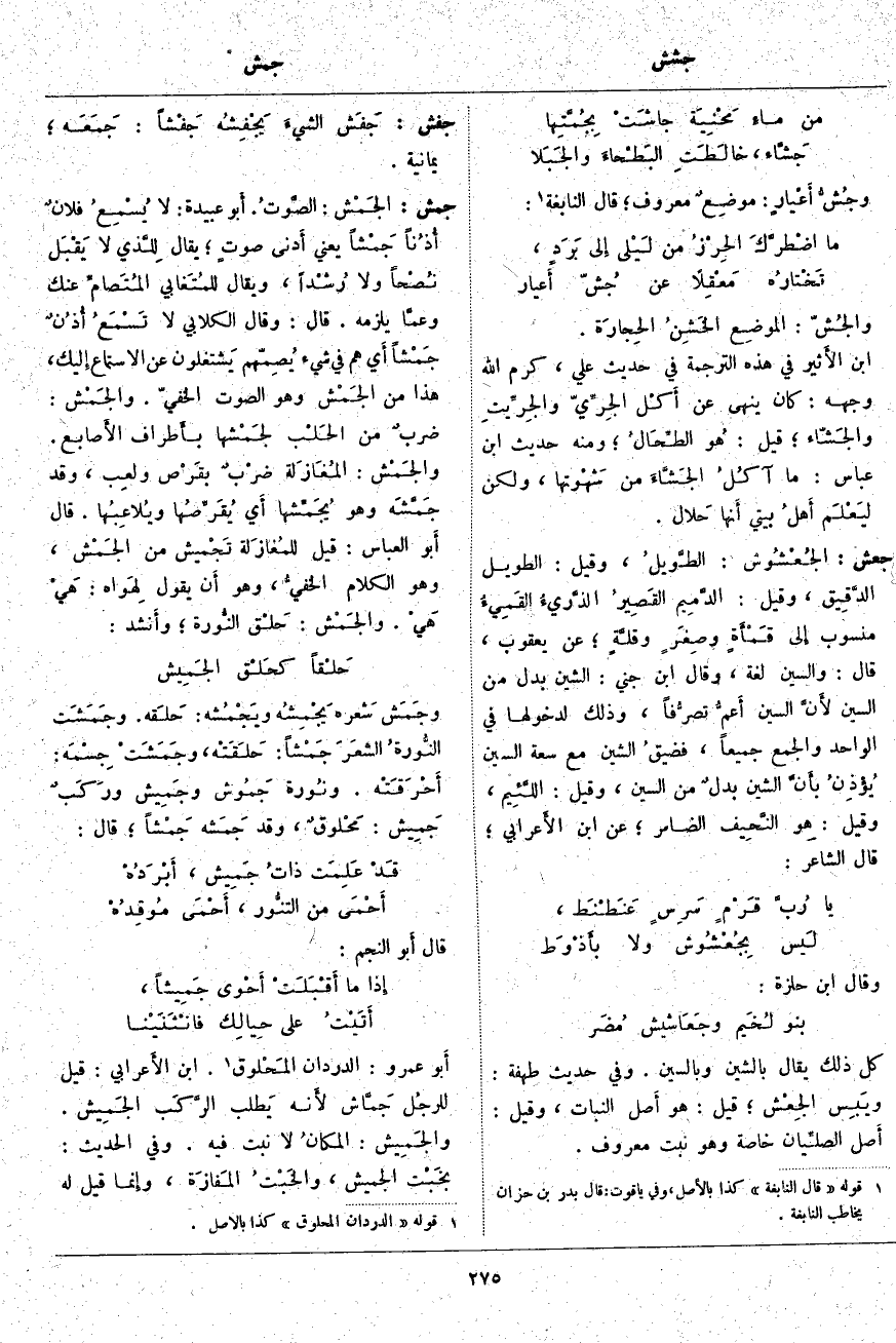جَعَشَ: الجُعْشُوش: الطَّويلُ، وَقِيلَ: الطَّوِيلُ الدَّقِيق، وَقِيلَ: الدَّمِيم القَصِيرُ الذَّريءُ القَمِيءُ مَنْسُوبٌ إِلى قَمْأَةٍ وصِغَرٍ وقلَّةٍ؛ عَنْ يَعْقُوبَ، قَالَ: وَالسِّينُ لُغَةٌ، وَقَالَ ابْنُ جِنِّي: الشين بدل من السين لأَنَّ السِّينَ أَعمُّ تصرُّفاً، وَذَلِكَ لِدُخُولِهَا فِي الْوَاحِدِ وَالْجَمْعِ جَمِيعًا، فضيقُ الشِّينِ مَعَ سَعَةِ السِّينِ يُؤْذِنُ بأَنَّ الشِّينَ بدلٌ مِنَ السِّينِ، وَقِيلَ: اللَّئِيم، وَقِيلَ: هُوَ النَّحِيف الضَّامِرُ؛ عَنِ ابْنِ الأَعرابي؛ قَالَ الشَّاعِرُ: