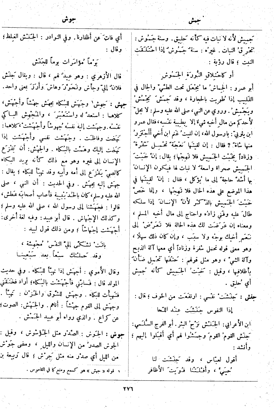 قَالَ الأَزهري: وَهُوَ عِيدٌ لَهُمْ، قَالَ: وَيُقَالُ جَنَش فلانٌ إِليّ وجأَش وتَحَوَّرَ وهاشَ وأَرَزَ بمعنى واحد.