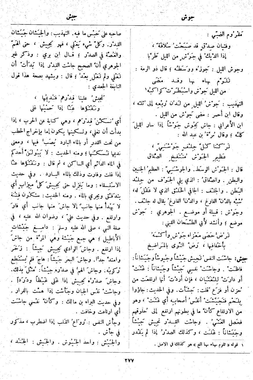 جيش: جاشَت النفسُ تَجِيش جَيْشاً وجُيوشاً وجَيَشاناً: فاظَتْ. وجاشَتْ نفسِي جَيْشاً وجَيشاناً: غَثَتْ أَو دارَتْ لِلْغَّثَيان، فإِن أَردْتَ أَنها ارتفعَت مِنْ حُزن أَو فزَع قُلت: جَشَأَت. وَفِي الْحَدِيثِ: