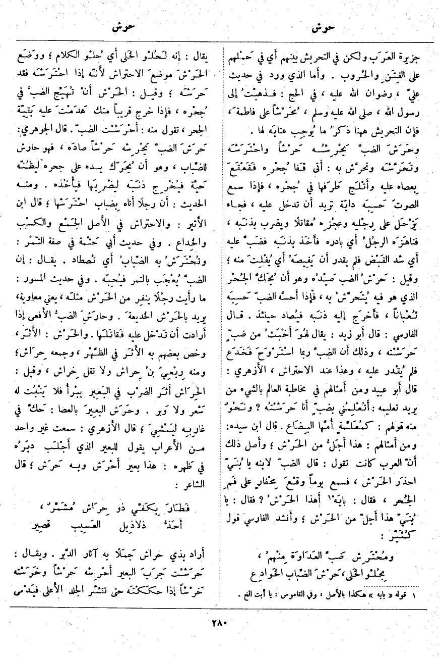 ، فإِن التَّحْرِيشَ هَاهُنَا ذكرُ مَا يُوجِب عتابَه لَهَا. وحَرَشَ الضبَّ يَحْرِشُه حَرْشاً واحْتَرَشَه وتَحَرَّشَه وتحرَّش بِهِ: أَتى قَفا جُحْرِه فَقَعْقَعَ بِعصاه عَلَيْهِ وأَتْلَج طَرَفها فِي جُحْره، فإِذا سَمِعَ الصوتَ حَسِبَه دَابَّةً تُرِيدُ أَن تَدْخُلَ عَلَيْهِ، فَجَاءَ يَزْحَل عَلَى رِجْليه وعجُزِه مُقاتلًا وَيَضْرِبُ بذنَبه، فناهَزَه الرجُلُ أَي بَادَرَهُ فأَخَذ بذنَبه فضَبَّ عَلَيْهِ أَي شَدَّ القَبْض فَلَمْ يَقْدِرْ أَن يَفِيصَهُ أَي يُفْلِتَ مِنْهُ؛ وَقِيلَ: حَرْشُ الضَّبِّ صَيْدُه وَهُوَ أَن يُحَكَّ الجُحْر الَّذِي هُوَ فِيهِ يُتَحرَّشُ بِهِ، فإِذا أَحسَّه الضَّبُّ حَسِبَه ثُعْباناً، فأَخْرَج إِليه ذنبَه فيُصاد حِينَئِذٍ. قَالَ الْفَارِسِيُّ: قَالَ أَبو زَيْدٍ: يُقَالُ لُهوَ أَخْبَثُ مِنْ ضبٍّ حَرَشْته، وَذَلِكَ أَن الضبَّ رُبَّمَا اسْتَرْوَحَ فَخَدَع فَلَمْ يُقْدر عَلَيْهِ، وَهَذَا عِنْدَ الِاحْتِرَاشِ، الأَزهري: قَالَ أَبو عُبَيْدٍ وَمِنْ أَمثالهم فِي مُخَاطَبَةِ الْعَالِمِ بِالشَّيْءِ مَنْ يُرِيدُ تَعْلِيمَهُ: أَتُعْلِمُني بضبٍّ أَنا حَرَشْتُه؟ ونَحْوٌ مِنْهُ قَوْلُهُمْ: كمُعَلِّمةٍ أُمَّها البِضَاع. قَالَ ابْنُ سِيدَهْ: وَمِنْ أَمثالهم: هَذَا أَجَلُّ مِنَ الحَرْش؛ وأَصل ذَلِكَ أَنّ الْعَرَبَ كَانَتْ تَقُولُ: قَالَ الضَّبُّ لِابْنِهِ يَا بُنَيّ احذَر الحَرْش، فَسَمِعَ يَوْمًا وقْعَ مِحْفارٍ عَلَى فَمِ الجُحر، فَقَالَ: بابَهْ «1» أَهذا الحَرْشُ؟ فَقَالَ: يَا بُنَيّ هَذَا أَجلّ مِنَ الحَرْش؛ وأَنشد الْفَارِسِيُّ قَوْلَ كُثَيّر: