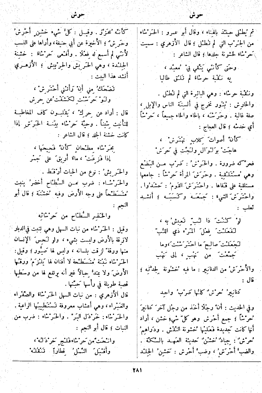 ؛ جَمْعُ أَحْرش وَهُوَ كُلُّ شيءٍ خَشِنٍ، أَراد أَنها كَانَتْ جَديدة فَعَليْها خُشونة النَّقْش. ودَراهِمُ حُرْشٌ: جِيادٌ خُشْنٌ حَديثة العَهد بالسِّكَّة. والضبُّ أَحْرَشُ، وضبٌّ أَحْرش: خَشِنُ الجِلْدِ كأَنَّه مُحَزَّز. وَقِيلَ: كلُّ شَيْءٍ خشِنٍ أَحْرشُ وحَرِشٌ؛ الأَخيرة عَنْ أَبي حَنِيفَةَ، وأُراها عَلَى النَّسَبِ لأَنّي لَمْ أَسمع لَهُ فِعْلًا. وأَفْعى حَرْشاءُ: خشِنة الجِلْدة، وَهِيَ الحَريِش والحِرْبيش؛ الأَزهري أَنشد هَذَا الْبَيْتَ: