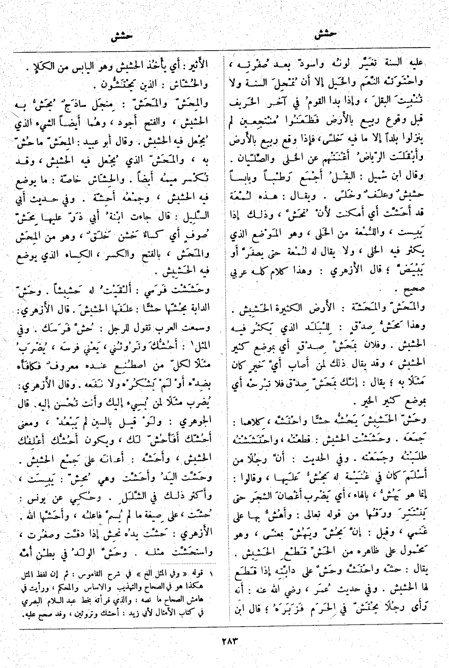 ، وَهُوَ مِنَ المِحَشّ والمَحَشّ، بالفتح والكسر، والكِساء الَّذِي يُوضَعُ فِيهِ الحَشِيش. وحَشَشْت فَرَسي: أَلْقَيْتُ لَهُ حَشِيشاً. وحَشّ الدَّابَّةَ يحُشّها حَشًّا: علَفَها الحشيشَ. قَالَ الأَزهري: وَسَمِعْتُ الْعَرَبَ تَقُولُ لِلرَّجُلِ: حُشَّ فَرَسَك. وَفِي الْمَثَلِ «1»: أَحُشُّكَ وتَرُوثُني، يَعْني فرسَه، يُضْرَبُ مثَلًا لِكُلِّ مَنِ اصطُنِع عِنْدَهُ معروفُ فكافَأَه بضِدِّه أَوْ لَمْ يَشْكُرْه وَلَا نَفَعه. وَقَالَ الأَزهري: يُضْرب مثَلًا لِمَنْ يُسِيء إِليك وأَنت تُحْسن إِليه. قَالَ الْجَوْهَرِيُّ: ولَوْ قِيلَ بِالسِّينِ لَمْ يَبْعُدْ، وَمَعْنَى أَحُشّك أَفَأَحُشّ لَكَ، وَيَكُونُ أَحُشُّك أَعْلِفُك الْحَشِيشَ، وأَحَشَّه: أَعانَه عَلَى جَمْع الْحَشِيشِ. وحَشَّت اليَدُ وأَحَشَّت وَهِيَ مُحِشّ: يَبِسَت، وأَكثر ذَلِكَ فِي الشَّلَلِ. وحُكِي عَنْ يُونُسَ: حُشَّت، عَلَى صِيغة مَا لَمْ يُسمَّ فاعلُه، وأَحَشَّها اللَّه. الأَزهري: حَشَّت يدُه تَحِشُّ إِذا دقَّت وصغُرت، واسْتَحَشَّتْ مِثْلُهُ. وحَشَّ الولَدُ فِي بطْن أُمِّه