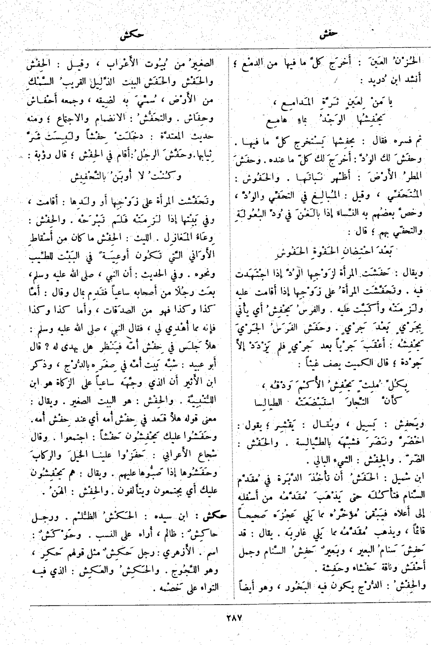 حكش: ابْنُ سِيدَهْ: الحَكْشُ الظُّلْم. وَرَجُلٌ حاكِشٌ: ظَالِمٌ، أُراه عَلَى النَّسَبِ. وحَوْكَشٌ: اسْمٌ. الأَزهري: رَجُلٌ حَكِشٌ مِثْلُ قَوْلِهِمْ حَكَر، وَهُوَ اللَّجُوج. والحَكِشُ والعَكِش: الَّذِي فِيهِ الْتِوَاءٌ عَلَى خَصْمه.