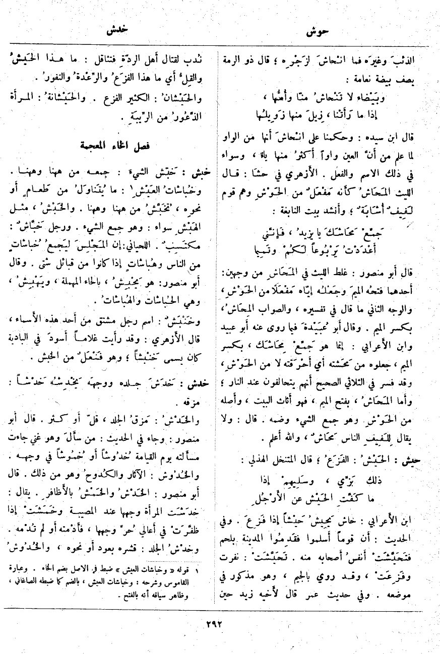 قَالَ ابْنُ سِيدَهْ: وَحُكْمُنَا عَلَى انْحاشَ أَنَّهَا مِنَ الْوَاوِ لِمَا عُلِمَ مِنْ أَنَّ الْعَيْنَ وَاوًا أَكثرُ مِنْهَا يَاءً، وَسَوَاءٌ فِي ذَلِكَ الِاسْمُ وَالْفِعْلُ. الأَزهري فِي حشَا: قَالَ اللَّيْثُ المَحَاشُ كأَنه مَفْعَلٌ مِنَ الحَوْشِ وَهُمْ قَوْمٌ لَفِيفٌ أُشَابَةٌ؛ وأَنشد بَيْتَ النَّابِغَةِ: