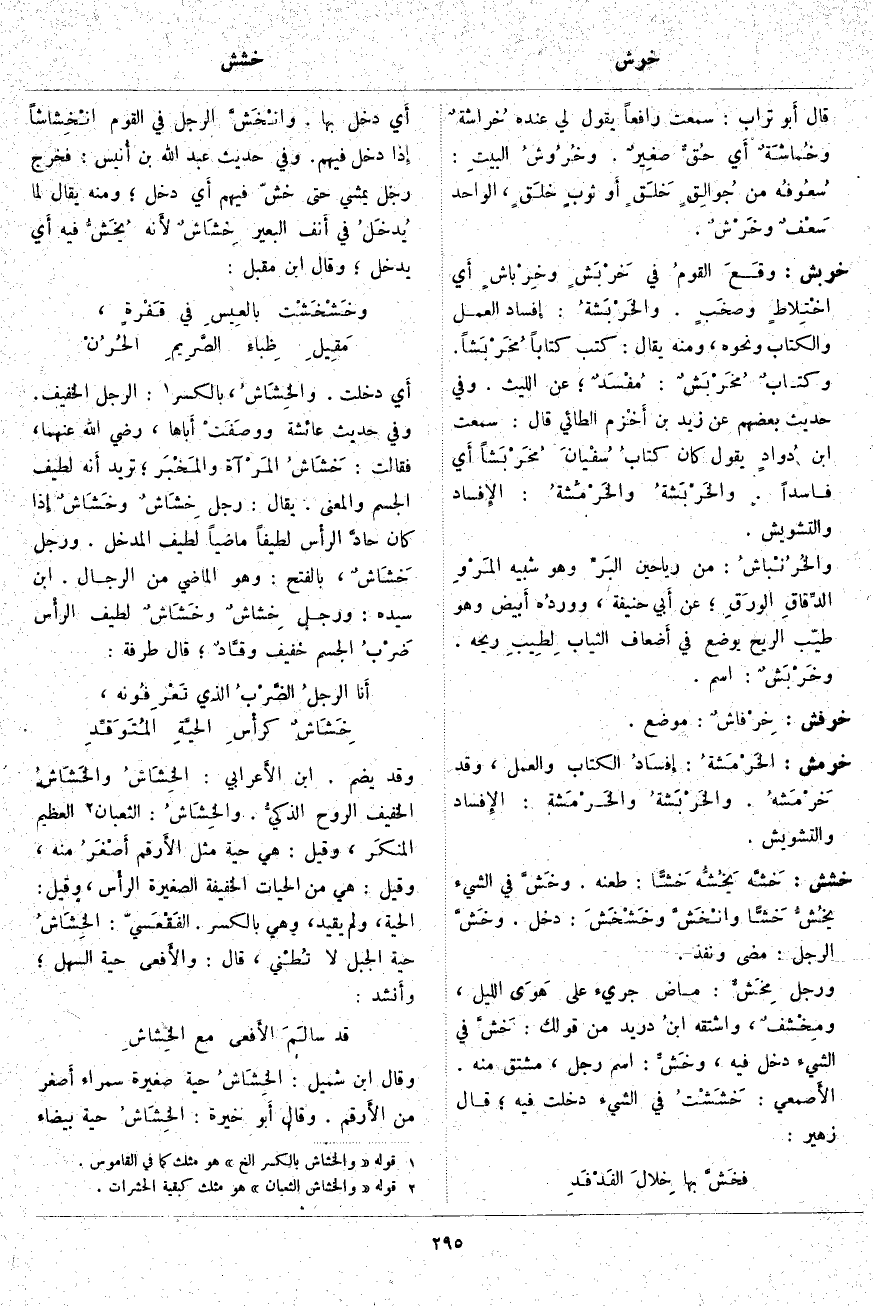 خشش: خَشَّه يَخُشُّه خَشًّا: طَعَنَهُ. وخَشَّ فِي الشَّيْءِ يخُشُّ خَشًّا وانْخَشَّ وخَشْخَشَ: دَخَلَ. وخَشَّ الرَّجُلُ: مَضَى وَنَفَذَ. وَرَجُلٌ مِخَشٌّ: مَاضٍ جَرِيءٌ عَلَى هَوَى اللَّيْلِ، ومِخْشفٌ، وَاشْتَقَّهُ ابنُ دُرَيْدٍ مِنَ قَوْلِكَ: خَشَّ فِي الشَّيْءِ دَخَلَ فِيهِ، وخَشٌّ: اسْمُ رَجُلٍ، مُشْتَقٌّ مِنْهُ الأَصمعي: خَشَشْتُ فِي الشَّيْءِ دَخَلْتُ فِيهِ؛ قَالَ زُهَيْرٌ: