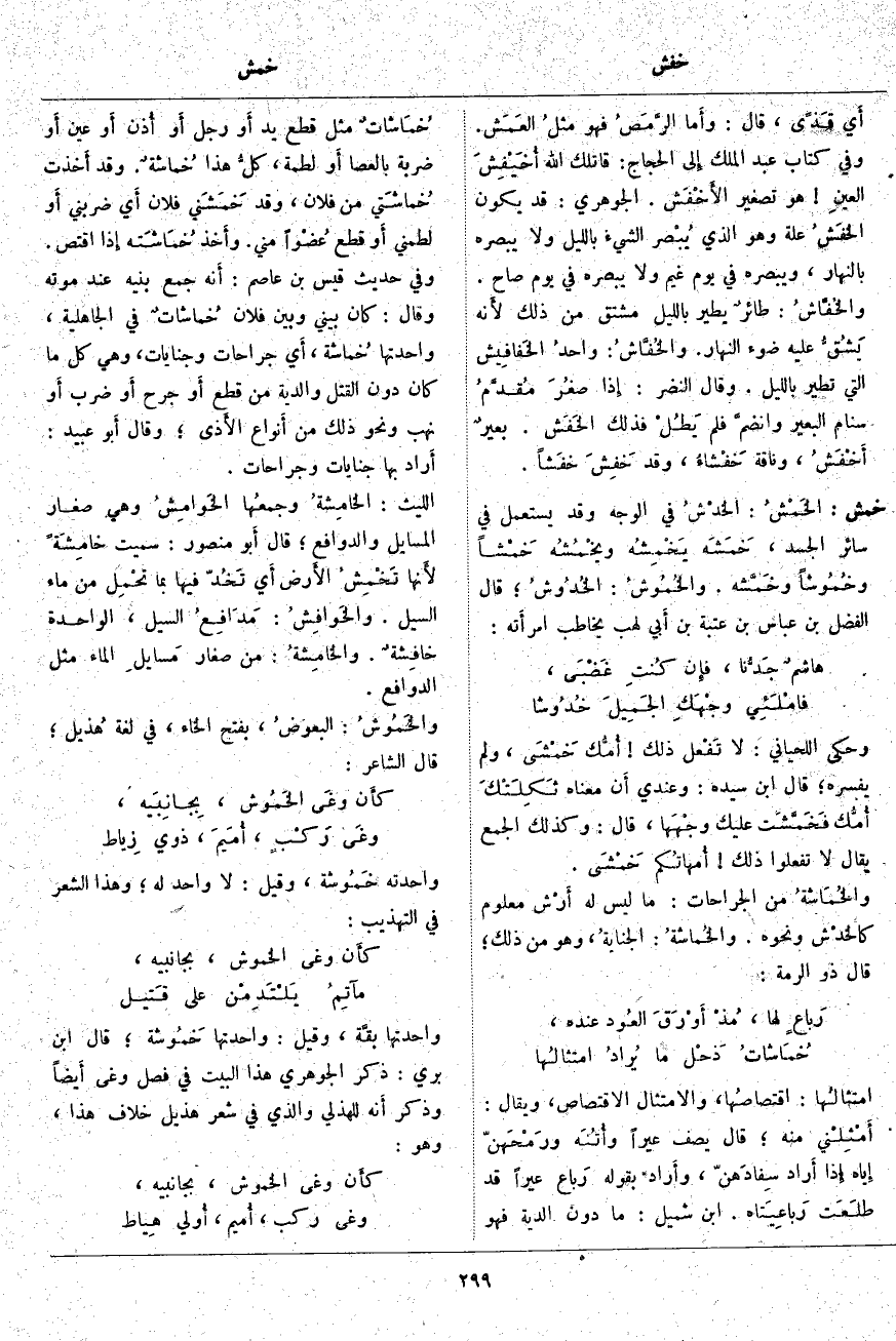 خمش: الخَمْشُ: الخدْشُ فِي الْوَجْهِ وَقَدْ يُسْتَعْمَلُ فِي سَائِرِ الْجَسَدَ، خَمَشَه يَخْمِشُه ويخمُشُه خَمْشاً وخُمُوشاً وخَمَّشه. والخُمُوشُ: الخُدُوشُ؛ قَالَ الْفَضْلُ بْنُ عَبَّاسِ بْنِ عُتْبَةَ بْنِ أَبي لَهَبٍ يُخَاطِبُ امرأَته: